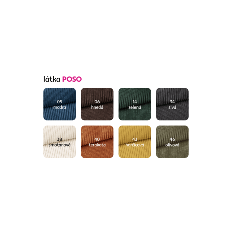 Možnosť objednania v 8 farebných prevedeniach látky Poso. Pri individuálnej objednávke je potrebné zaplatiť 20% zálohu z danej sumy. Po uhradení zálohy bude Vaša požiadavka zadaná do výroby. Doba dodania 6-8 týždňov.