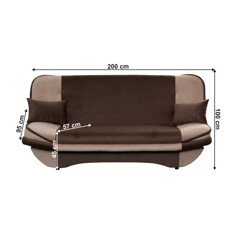 Materiál: látka Soro 23/28 Oderuodolnosť textílie podľa testu Martindale: 90 000 - 100 000 oderov Farba: sivohnedá Taupe/hnedá Rozmery (ŠxHxV): 200x95x100 cm Výška sedu: 45 cm Hĺbka sedu: 57 cm Plocha na spanie (ŠxD): 122x200 cm Plastové nožičky Výška spodného priestoru od podlahy: 2 cm Výplň: bonelová pružina/pur pena Rozkladacia Nosnosť na osobu: 90 kg Praktická Moderná Klasický štýl Dodávaná s dvoma dekoratívnymi vankúšmi S úložným priestorom Dodávané v demonte