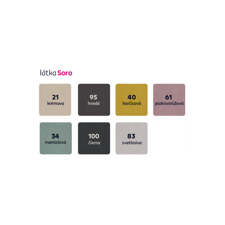 Možnosť objednania v 7 farebných prevedeniach látky Soro s možnosťou výberu dreva vo farbe orech alebo buk. Cena sa pri individuálnej objednávke líši, potrebné je zaplatiť 10% zálohu.