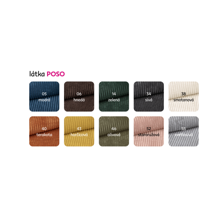 Ponúkame vám možnosť vybrať si z 10 farebných prevedení látky Poso v cene 749 Eur. Pri individuálnej objednávke je potrebné zaplatiť 10% zálohu z danej sumy. Po uhradení zálohy bude Vaša požiadavka zadaná do výroby. Dodacia lehota 6-8 týždňov.
