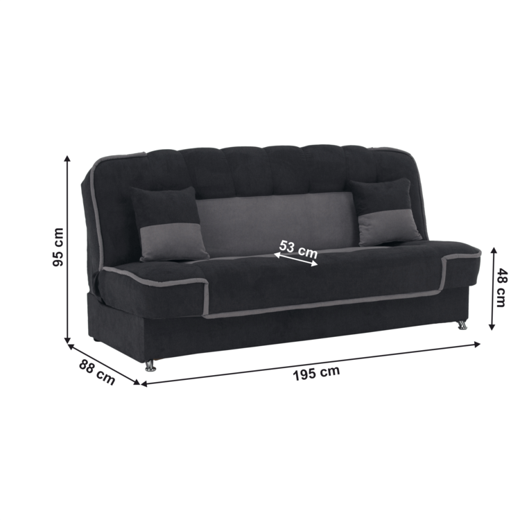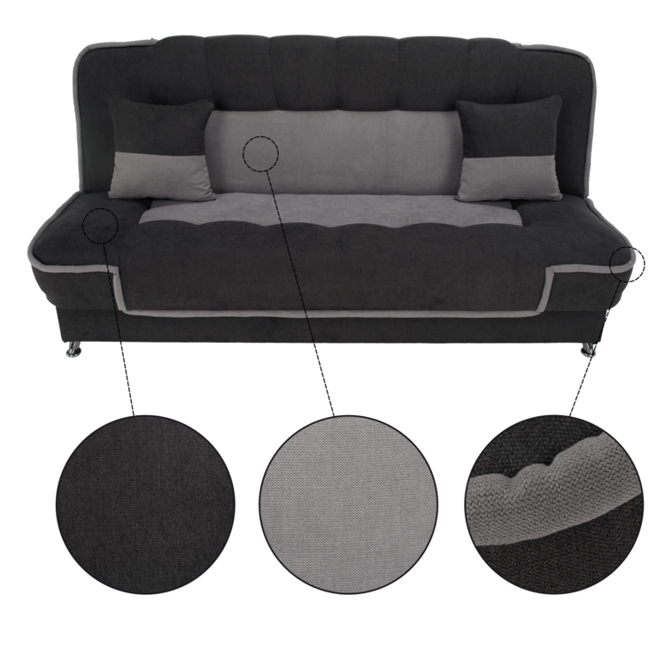 Pohovka PERSI je jednoduchá, ale štýlová. Ideálna do akéhokoľvek interiéru. Je čalúnená látkou Soro v kombinácií tmavosivej a svetlosivej. Pýši sa možnosťou rozkladu, ktorý môžete využívať nielen na občasné spanie, ale aj na každodenné spanie. Plocha na spanie predstavuje rozmer 123x196 cm. O rozklad sa poskladá funkcia klik klak, ktorá umožní nastaviť operadlo pohovky do zvislej a vodorovnej polohy. Má priestranný úložný priestor a komfort sedenia a spania zabezpečuje bonelová pružina s pur penou. PERSI je postavená na kovových nožičkách v chrómovom prevedení. Súčasťou pohovky sú dva dekoratívne vankúšiky.