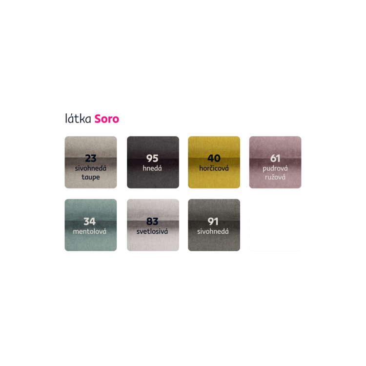 Možnosť objednania v 7 farebných prevedeniach látky Soro. Cena sa pri individuálnej objednávke líši, potrebné je zaplatiť 10% zálohu. Po uhradení zálohy bude Vaša požiadavka zadaná do výroby. Doba dodania 6-8 týždňov.