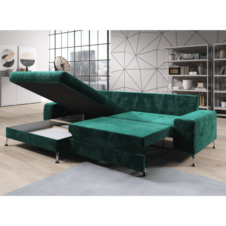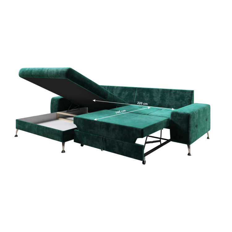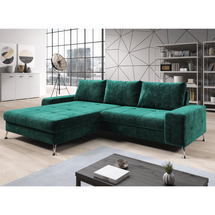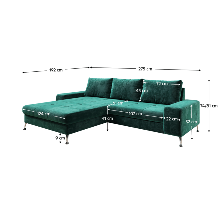 Štýlová rohová sedačka VASAT ROH sa vďaka svojmu dizajnu hodí do väčšiny interiérov. Nožičky s veľkosťou 9 cm poskytnú bohatý priestor pre väčšinu robotických vysávačov. Sú kovové v prevedení chróm. Disponuje úložným priestorom, ktorý sa nachádza v otomanovej časti sedacej súpravy. O nečakaný nocľah sa postará rozklad s bohatým priestorom na spanie s rozmerom 145x220 cm. VASAT ROH je celočalúnený príjemnou látkou Monolith v smaragdovej farbe. Na komfotnom sedení sa podpisuje výplň sedacej súpravy v podobe pružina falista a pur pena. Dodávaná je s troma vankúšmi, ktoré sa postarajú o opretie unaveného chrbta.