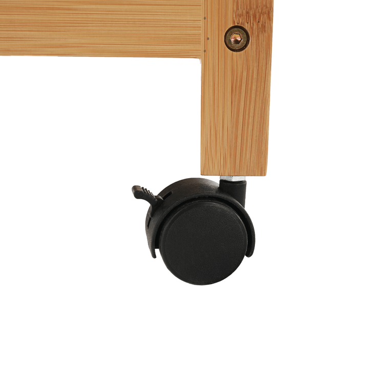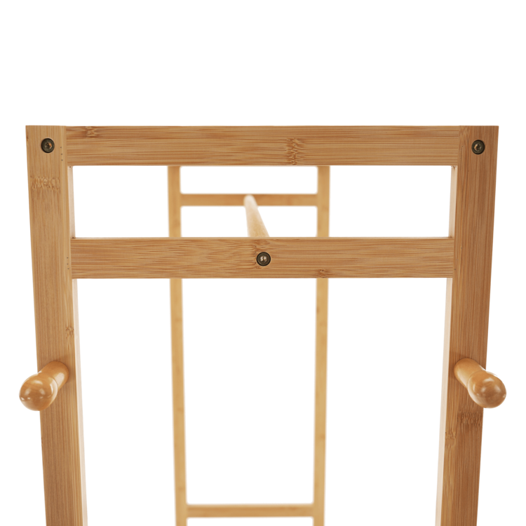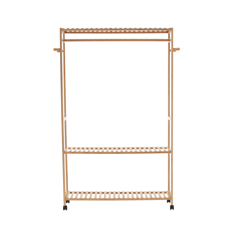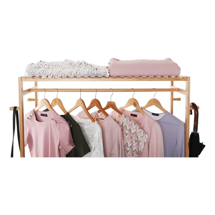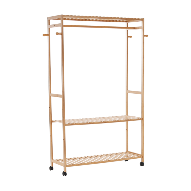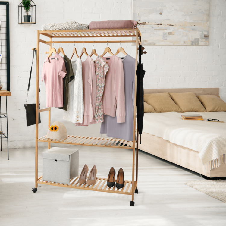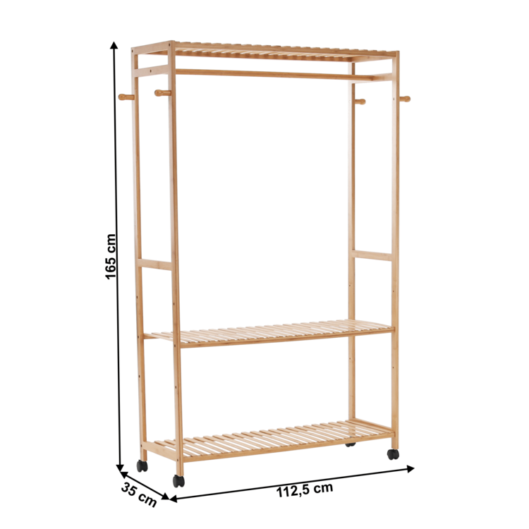 Šatníkový organizér MELAR má skvelý funkčný dizajn a je vyrobený z prírodného bambusu. Poskytuje ideálny úložný priestor pre vaše oblečenie kdekoľvek a v ktorejkoľvek miestnosti. Stojan je pojazdný vďaka kolieskam. Skladá sa z 2 políc v spodnej časti, 1 police v hornej časti a vešiakovej tyče. Po bočných stranách stojana sú umiestnené 4 háčiky, ktoré môžete využiť na zavesenie rôznych doplnkov.