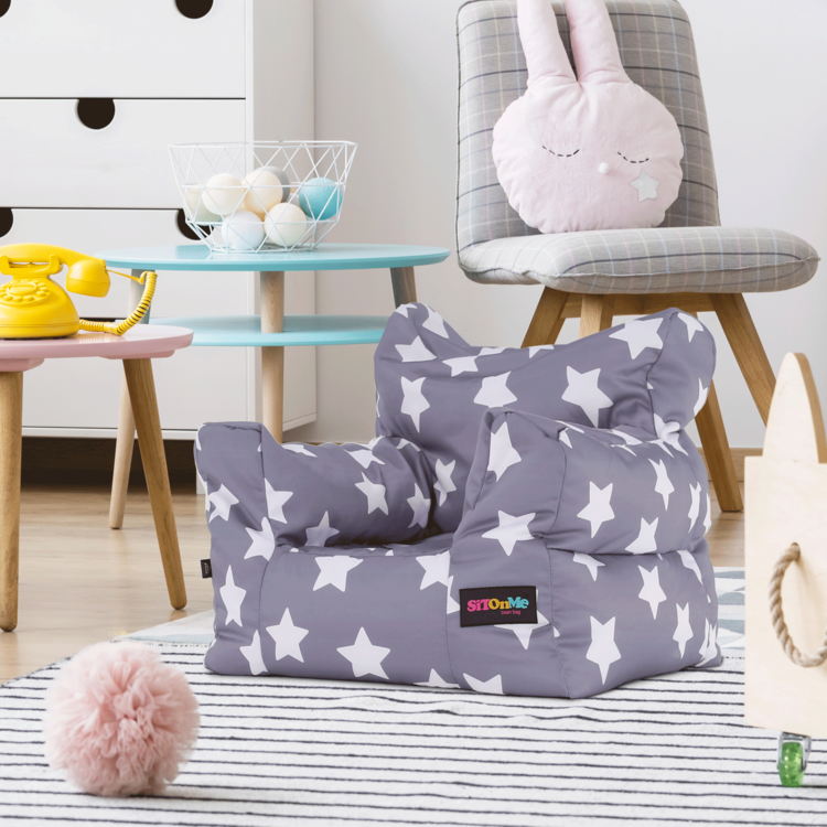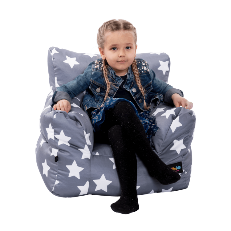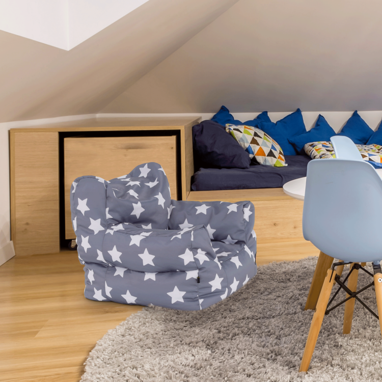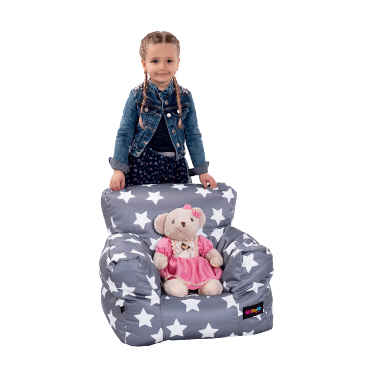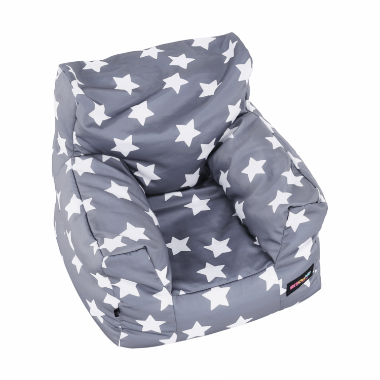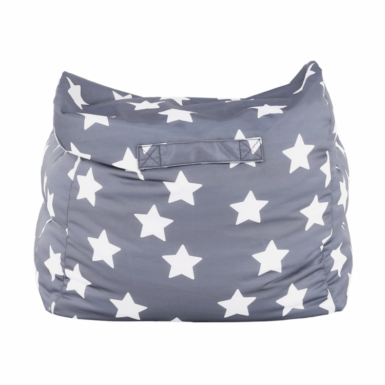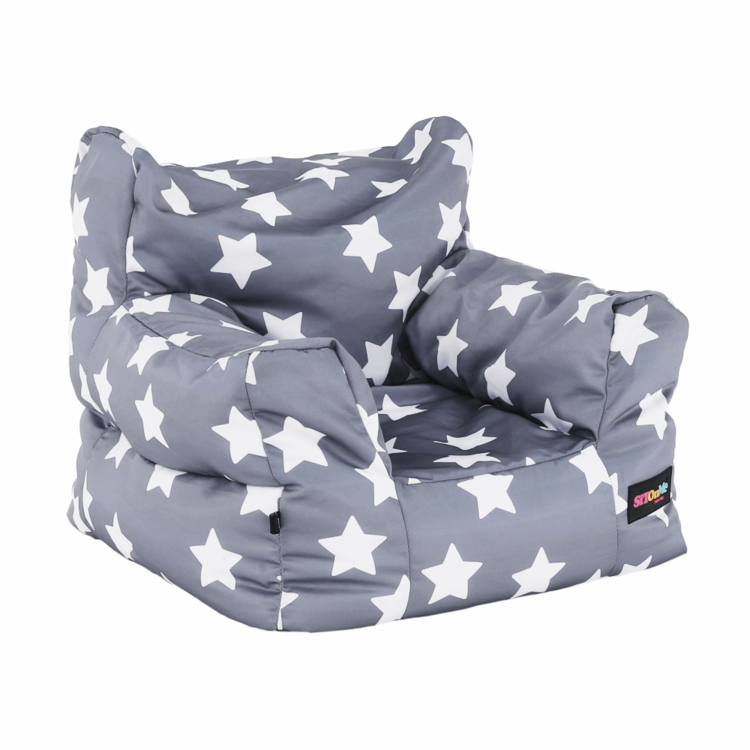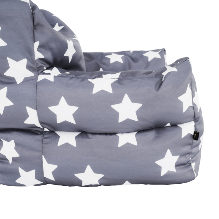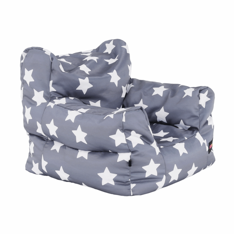 Sedací vak LURKO v sivej látke, ktorá je dotvorená bielymi hviezdičkami. Sedací vak je vyplnený polystyrénovými guľôčkami, ktoré sú zdravotne nezávadné. LURKO sa prispôsobí každej detskej postave. Pohodlie dotvárajú bočné opierky, ktoré ponúkajú komfortnejšie sedenie. Na zadnej strane vaku sa nachádza praktické uško, vďaka ktorému je možné vak ľahko preniesť.