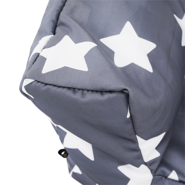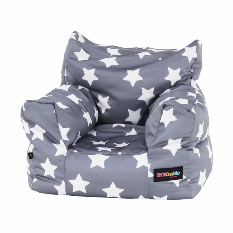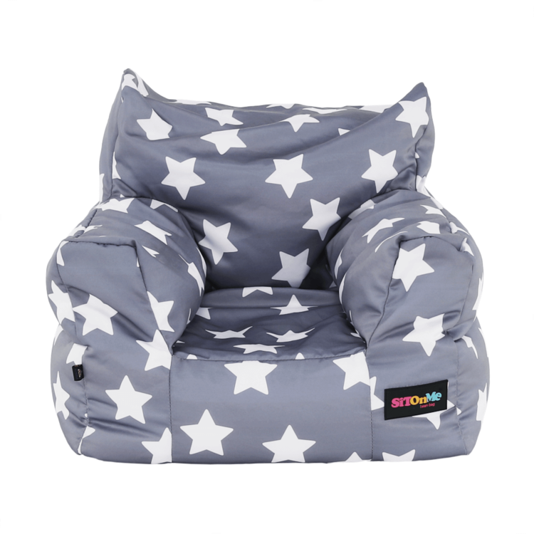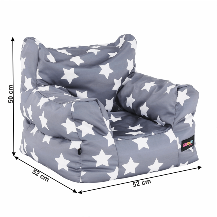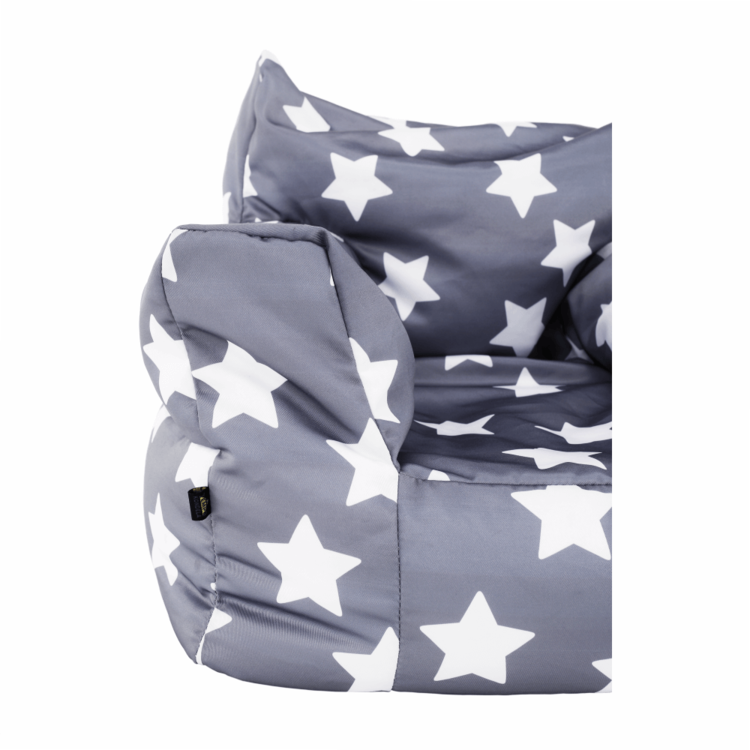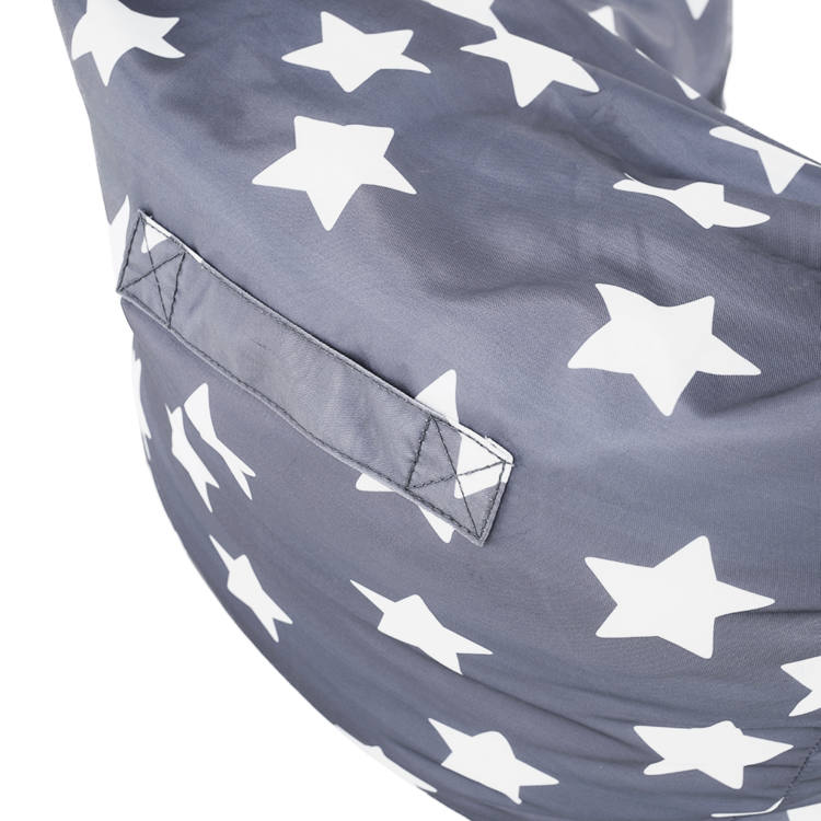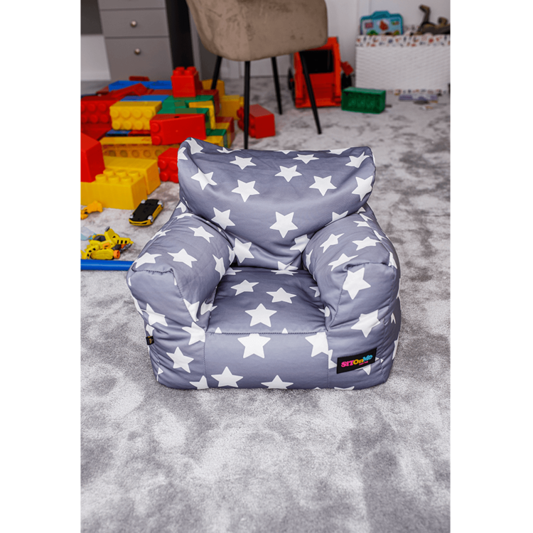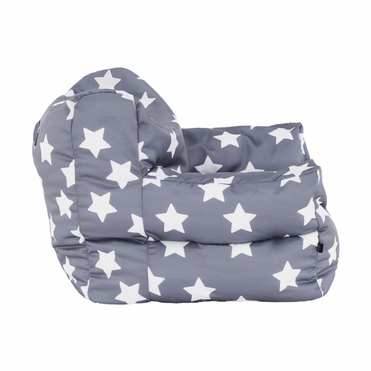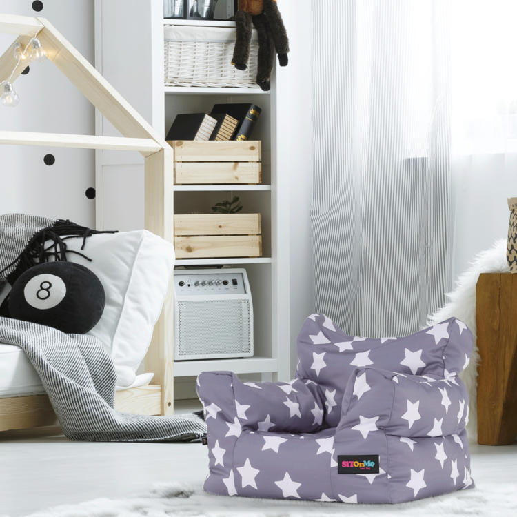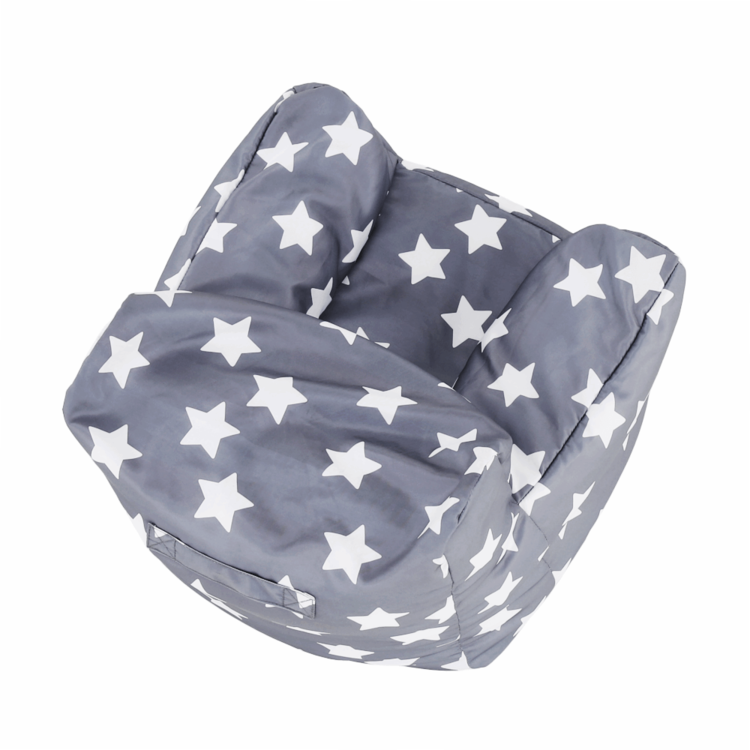 Sedací vak LURKO v sivej látke, ktorá je dotvorená bielymi hviezdičkami. Sedací vak je vyplnený polystyrénovými guľôčkami, ktoré sú zdravotne nezávadné. LURKO sa prispôsobí každej detskej postave. Pohodlie dotvárajú bočné opierky, ktoré ponúkajú komfortnejšie sedenie. Na zadnej strane vaku sa nachádza praktické uško, vďaka ktorému je možné vak ľahko preniesť.