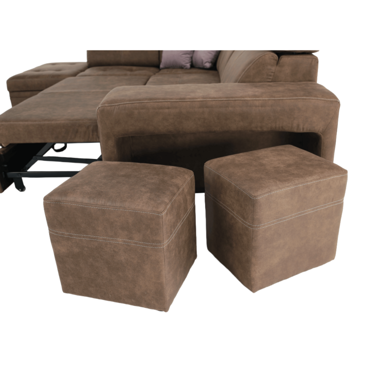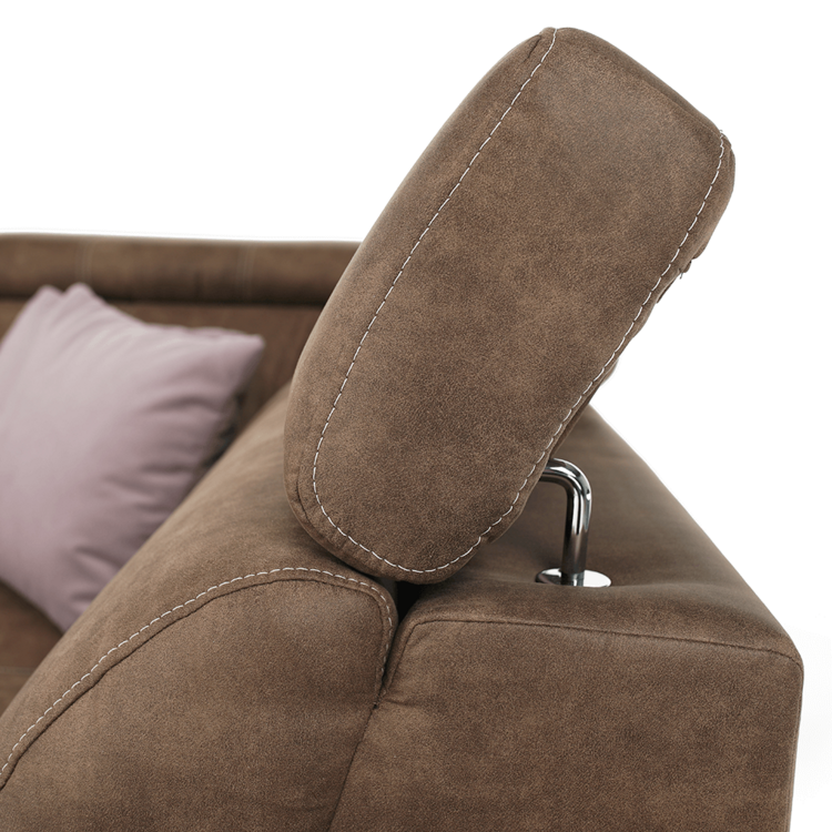 V bočnom otomane nájdete úložný priestor. Lanza je vybavená polohovacím záhlavím, ktoré zabezpečuje pohodlné opretie chrbta a hlavy. Sedačku dokážete rozložiť na príležitostné lôžko a získať tak plochu na spanie s rozmerom 120x190 cm. Sedačka taktiež disponuje dvoma taburetmi, ktoré sú umiestnené v opierke na ruky. Vyrobená ja z kvalitnej látky s efektom brúsenej kože Preston v hnedej farbe. Látka Jasmine v svetlofialovej farbe sa krásne vyníma na dvoch dekoratívnych vankúšoch, ktoré sú dodávané so sedačkou. Jadro sedacej časti je pružina falista a HR pena.