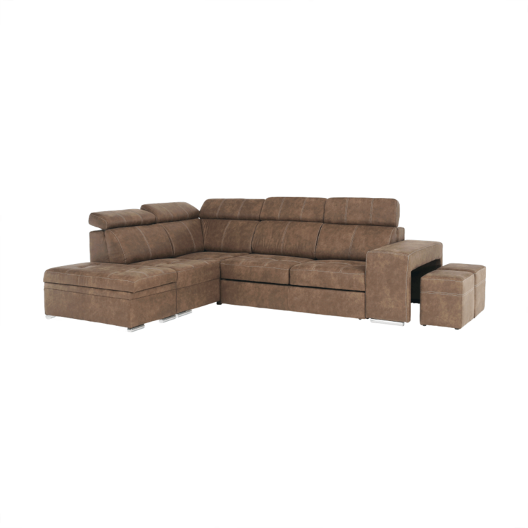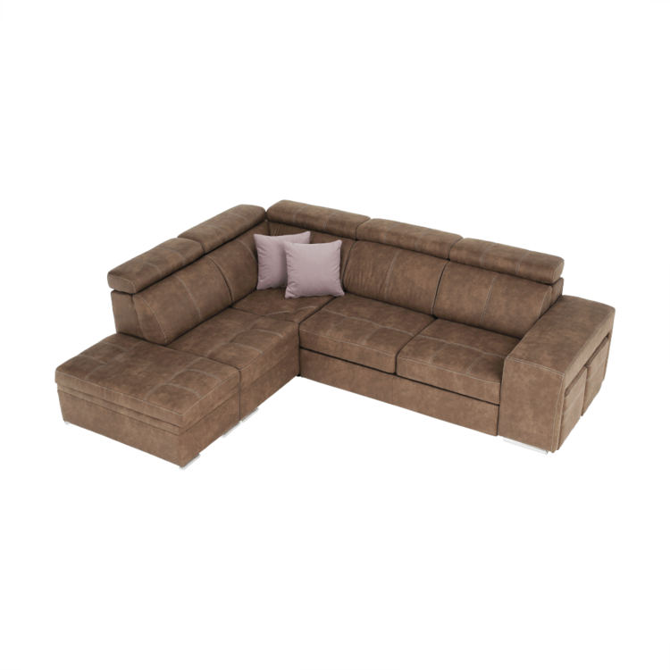 Celočalúnená rohová rozkladacia sedacia súprava s úložným priestorom a s polohovacím záhlavím.