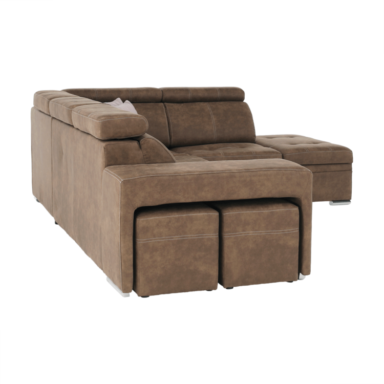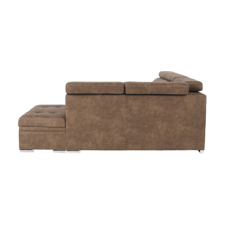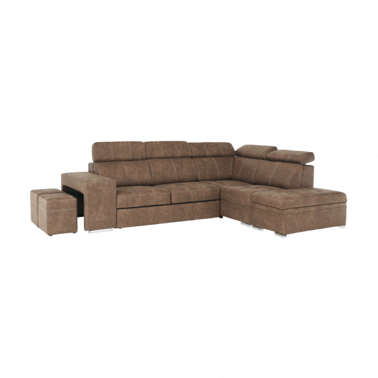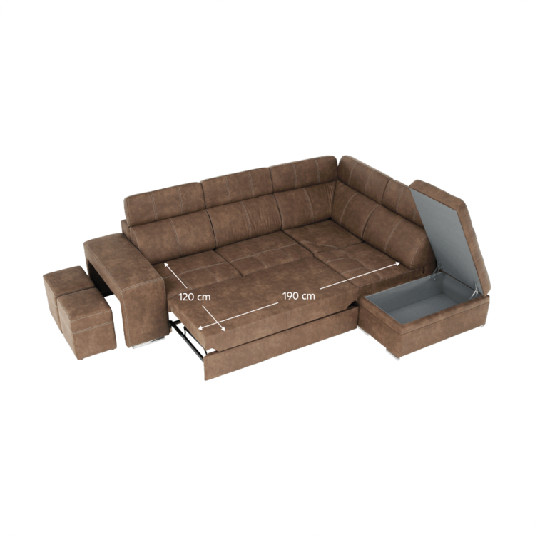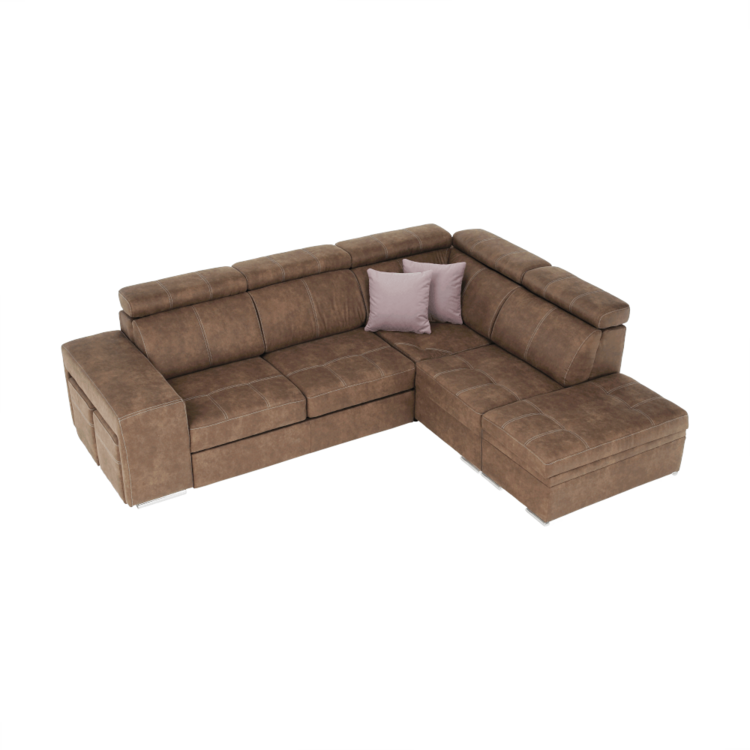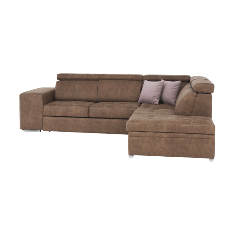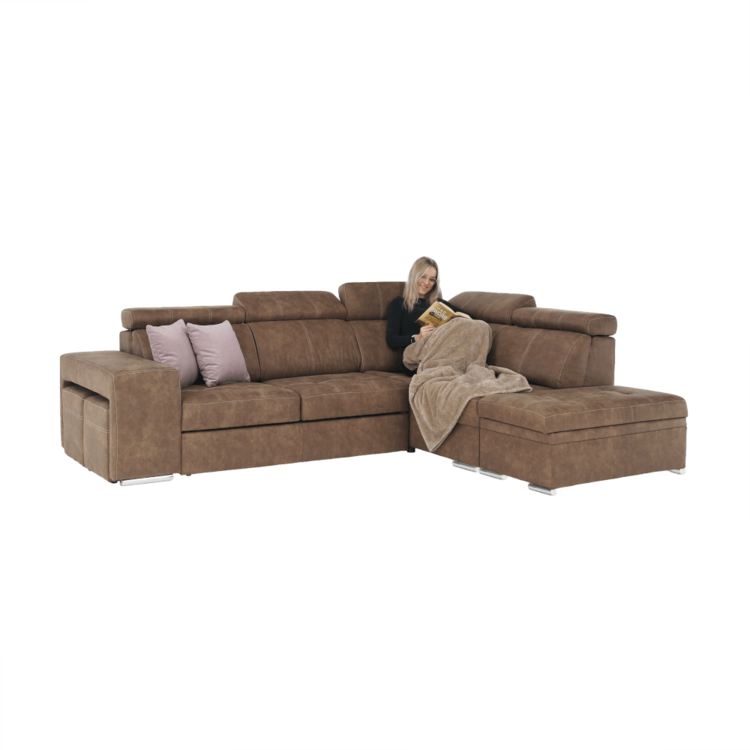 Celočalúnená rohová rozkladacia sedacia súprava s úložným priestorom a s polohovacím záhlavím.
