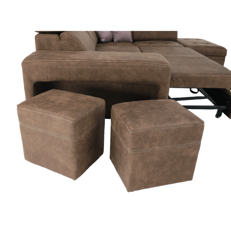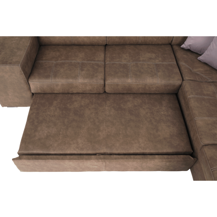V bočnom otomane nájdete úložný priestor. Lanza je vybavená polohovacím záhlavím, ktoré zabezpečuje pohodlné opretie chrbta a hlavy. Sedačku dokážete rozložiť na príležitostné lôžko a získať tak plochu na spanie s rozmerom 120x190 cm. Sedačka taktiež disponuje dvoma taburetmi, ktoré sú umiestnené v opierke na ruky. Vyrobená ja z kvalitnej látky s efektom brúsenej kože Preston v hnedej farbe. Látka Jasmine v svetlofialovej farbe sa krásne vyníma na dvoch dekoratívnych vankúšoch, ktoré sú dodávané so sedačkou. Jadro sedacej časti je pružina falista a HR pena.