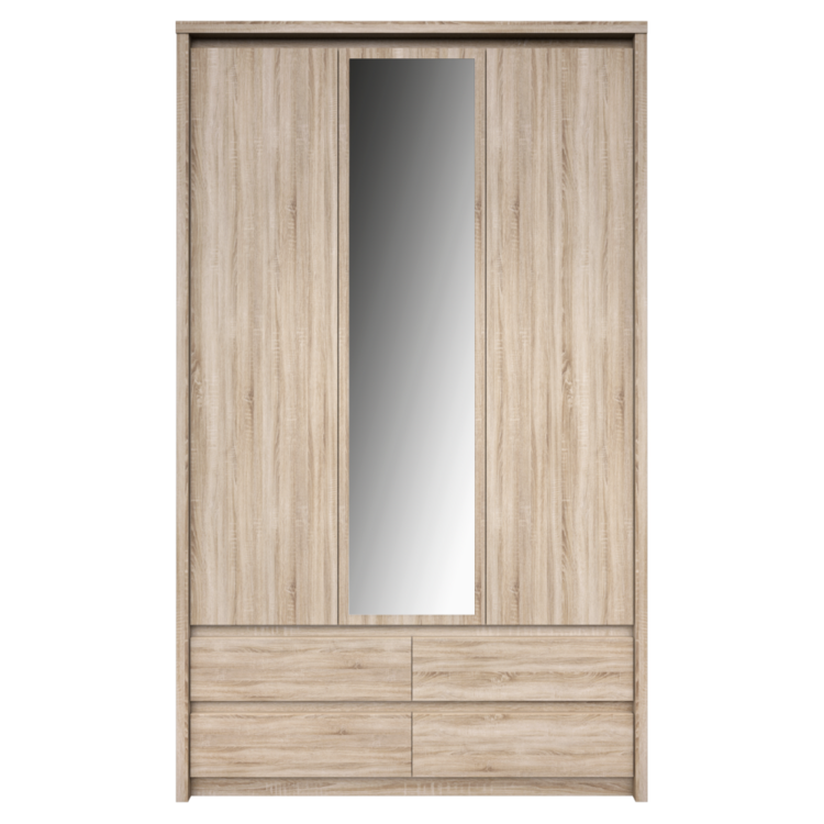 Skriňa 3D4S NORTY TYP 1 je priestranná trojdverová skriňa s veľkým zrkadlom v strede. Poskytuje dostatok miesta na vaše veci v vešiakovej aj policovej časti. Nad vešiakovou tyčou sa nachádza širšia polica a v dolnej časti skrine sú štyri šuplíky na ďalšie úložné predmety.
