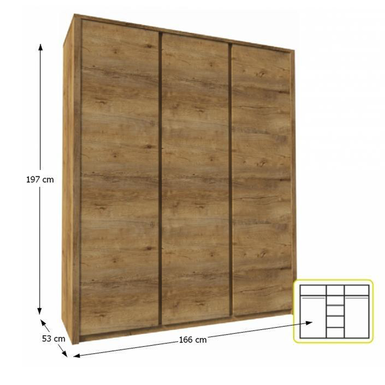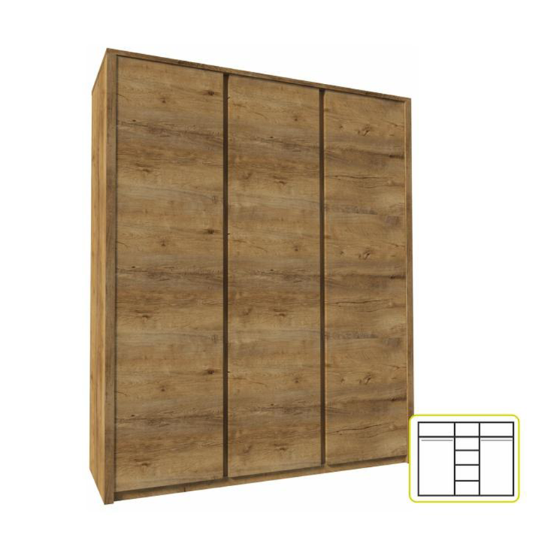 MONTANA S3D je trojdverová skriňa. Pravá a ľavá časť sú vešiakové s vešiakovou tyčou a jednou policou, stredná časť je poličková so štyrmi policami. Jej moderný dizajn bez úchytiek pôsobí veľmi štýlovo.