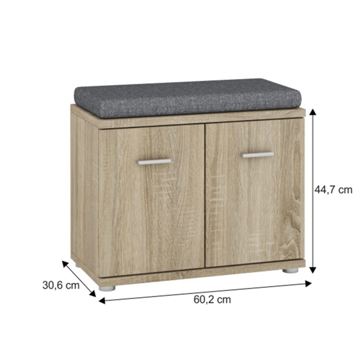 Skrinka/bez podušky, Mario New Typ F, komponent z predsieňovej zostavy MARIO NEW, je dodávaná bez podušky, ktorú si môžete objednať v našom eshope. Skrinka je s dvierkami, za ktorými nájdete jednu policu. Vyrobená je z kvalitnej DTD laminovanej vo farebnom prevedení dub sonoma.