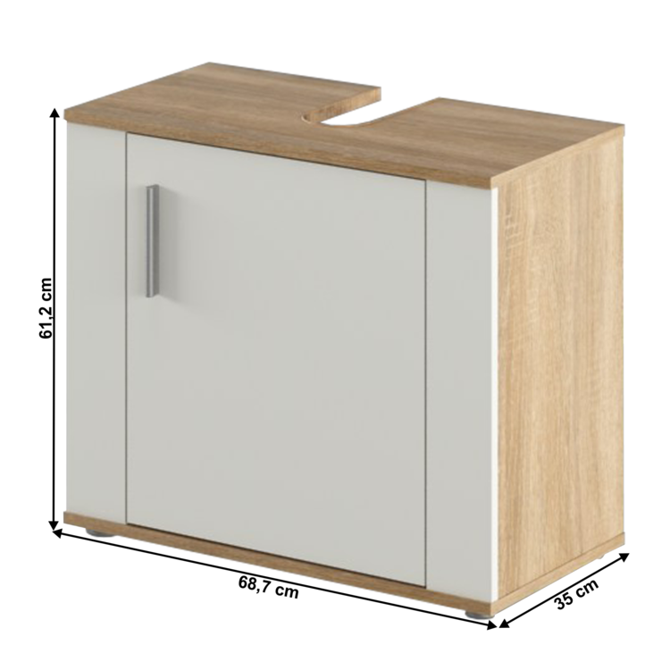 Kúpeľňová zostava LESSY NEW je vyrobená z kvalitnej laminovanej DTD v nestarnúcej kombinácii dub sonoma a biela.