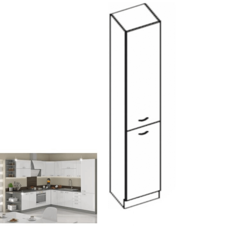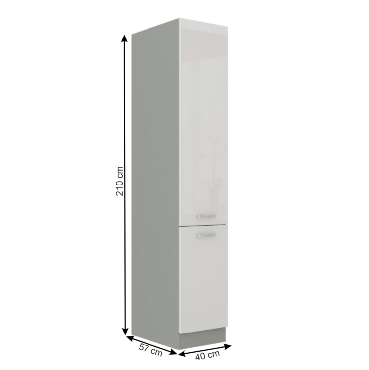 Dolná vysoká dvojdverová skrinka, Materiál: DTD laminovaná, Prevedenie: biela vysoký lesk, Rozmery ŠxVxH: 40x210x57 cm. Dodávané v demonte. Sektorové skrinky sú dodávané bez pracovnej dosky vrátane spodnej lišty. Možnosť dokúpiť PD travertyn v cene 40 Eur/1m. Možnosť dokúpiť univerzálny Ľ/P drez v cene 69 Eur.