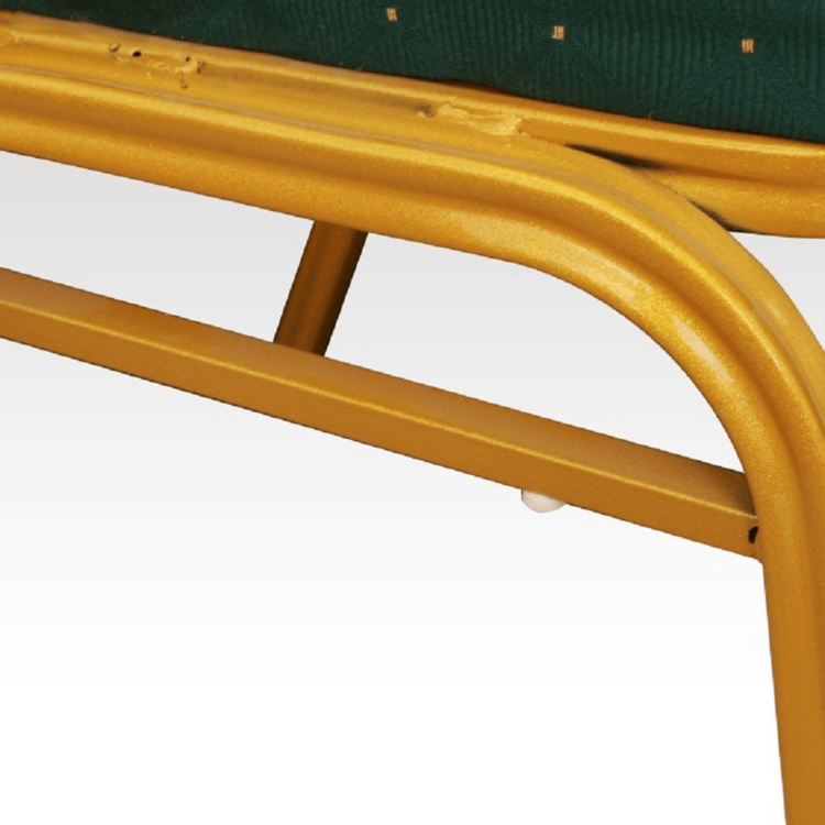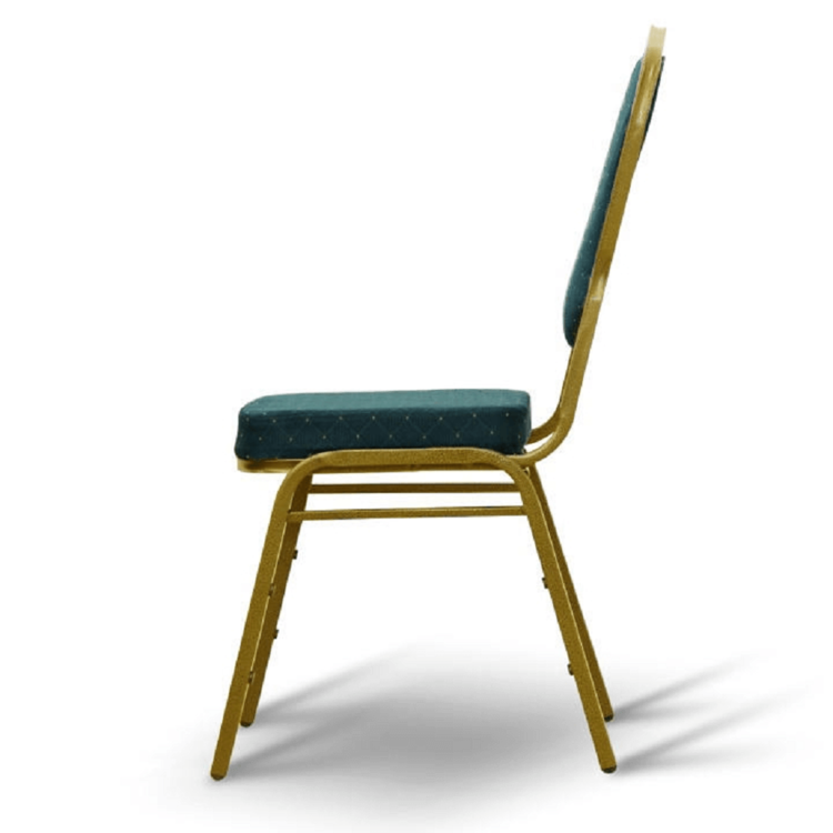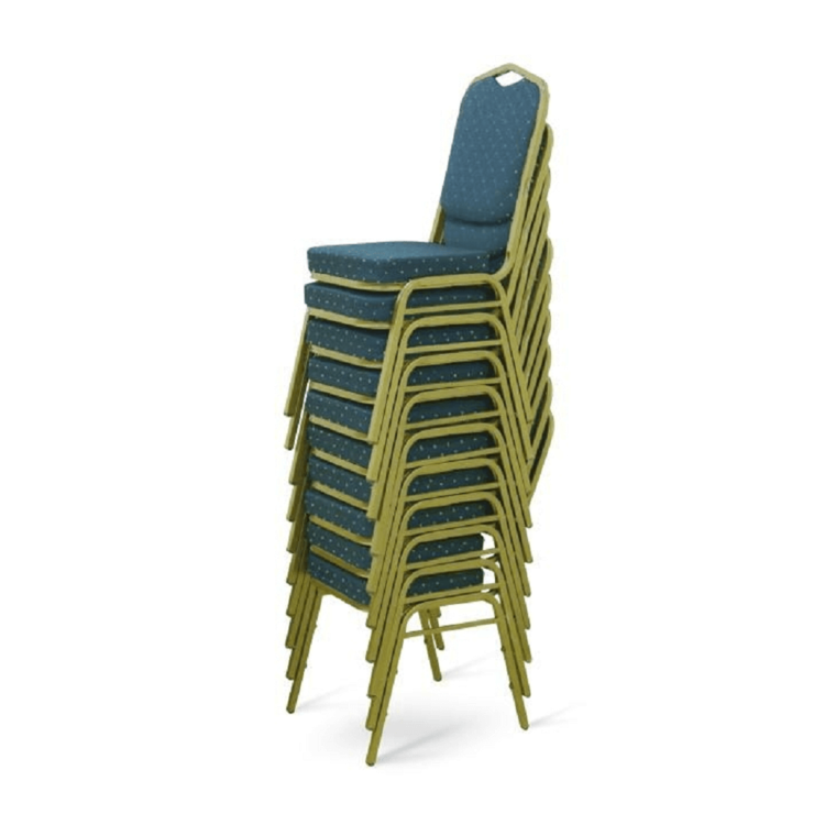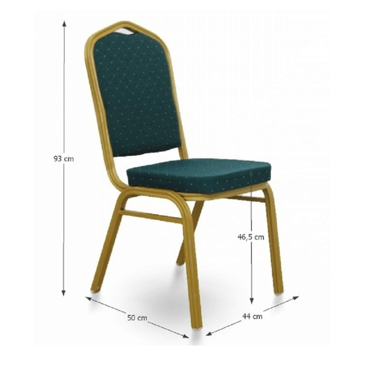 Ak zariaďujete reštauráciu či kaviareň, alebo hľadáte stoličky k banketom či routom, prípadne v zasadačke alebo konferenčnej miestnosti. Stolička je stohovateľná, ľahko stoličky poukladáte na seba. Jednak tým šetríte miesto, na druhej strane viete stoličky jednoducho presúvať medzi miestnosťami. Pre ľahšiu manipuláciu sa vo vrchnej časti rámu nachádza otvor pre lepšie uchopenie. Pevný rám je vyrobený z kovu v matnom zlatom odtieni. Sedacia časť aj operadlo sú čalúnené zelenou látkou. Určite oceníte aj nosnosť stoličky, ktorá dosahuje až 100 kg.