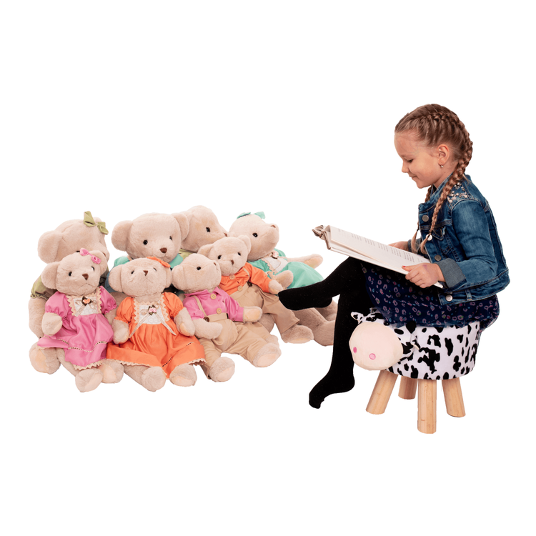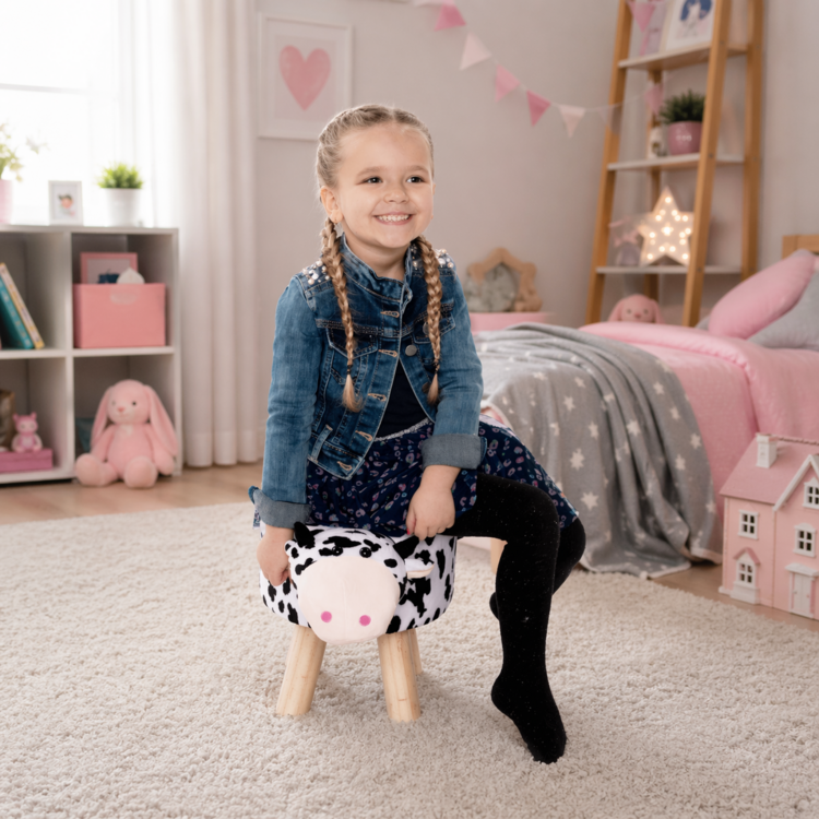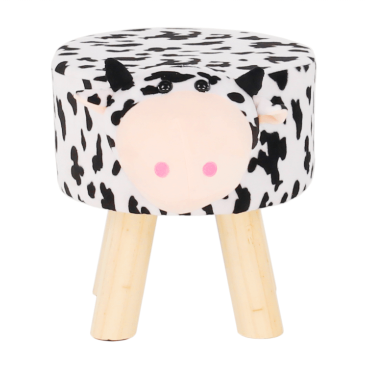 Oblečený je v látke Velvet v bielej farbe, ktorú jemne dopĺňajú čierne machule. Stabilitu tejto taburetke zabezpečujú drevené masívne nohy v prírodnom prevedení. Vyčarujte úsmev na tvári vášho dieťatka s kravičkou MOLLY.