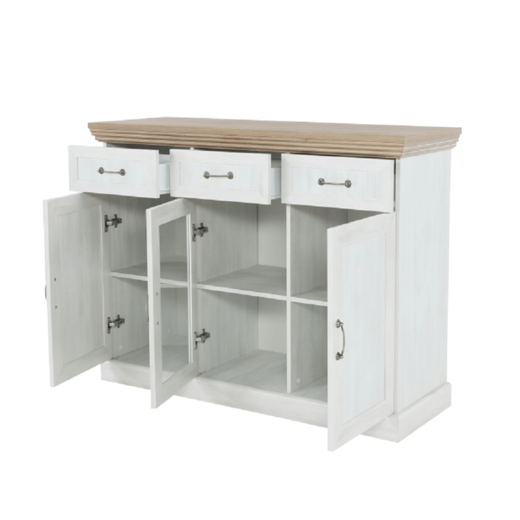 Komoda K1S, trojdverová, s tromi šuplíkmi, z elegantného sektorového systému Royal v provensálskom štýle. Vhodný na zariadenie obývacích izieb či spální.