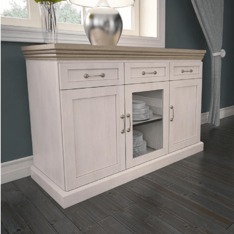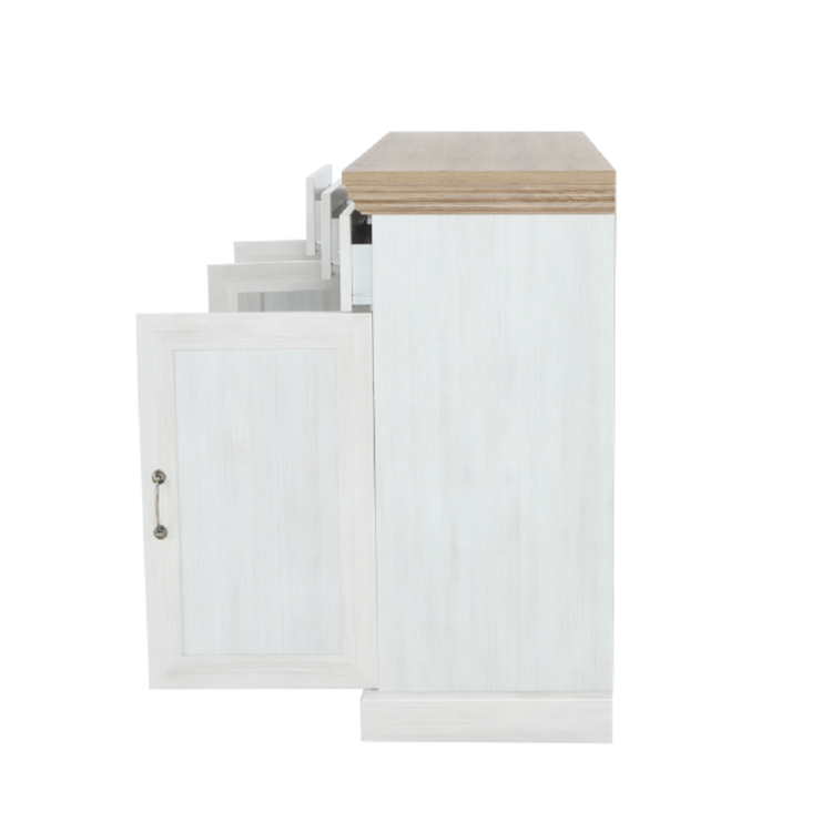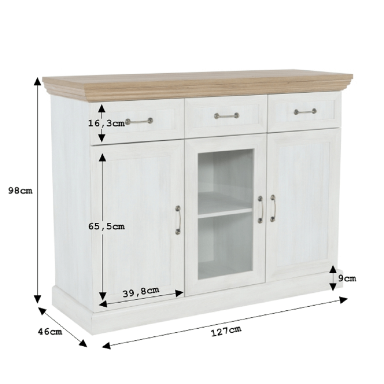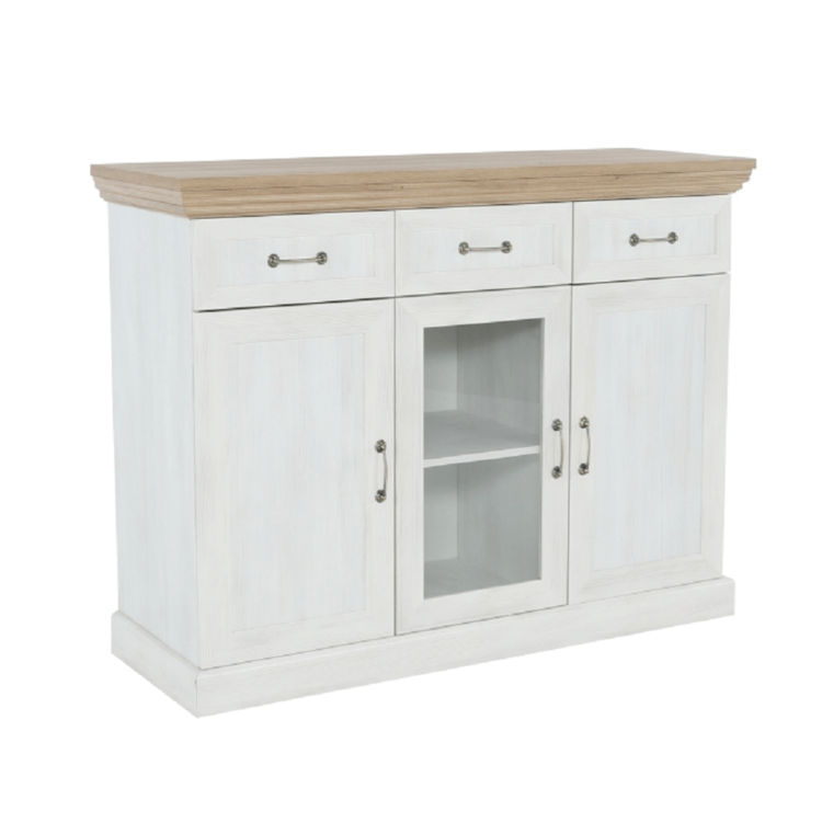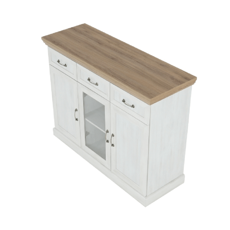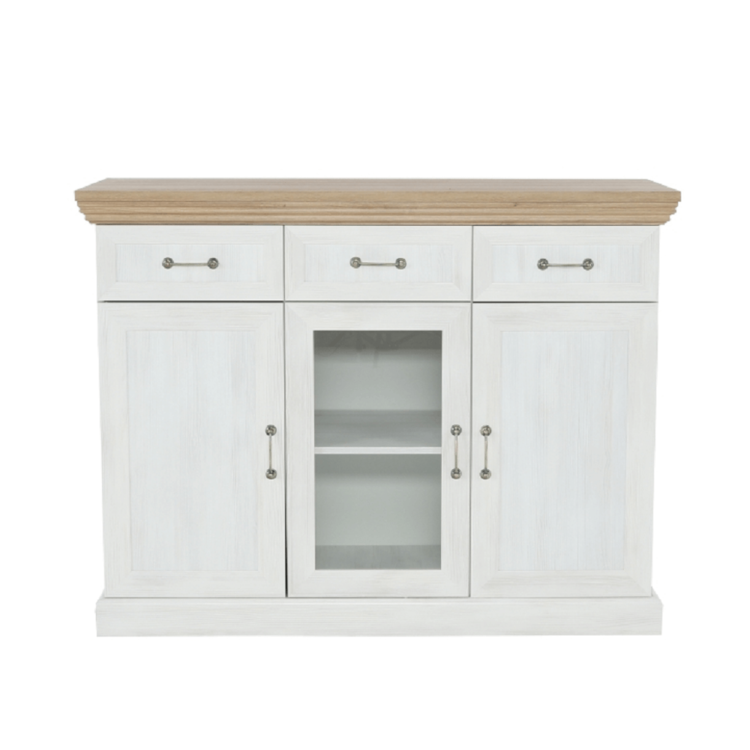 Komoda ROYAL K1S sa môže pýšiť čistými líniami a prepracovaným dizajnom. Vyrobená je z laminovanej drevotriesky. Provensálsky vzhľad jej dodáva farebná kombinácia sosny nordickej a duba divokého. Sosna nordická svojou kresbou násobí dojem francúzskeho vidieka. Komoda je obohatená ozdobnými lištami. Určite oceníte jej multifunkčnosť. Komoda je trojdverová, stredné dvierka sú sklenené. Vnútro skriniek je policou rozdelené na dve odkladacie plochy. Vo vrchnej časti nájdete tri rovnako veľké šuplíky, ktoré sa otvárajú pomocou kovových úchytiek.