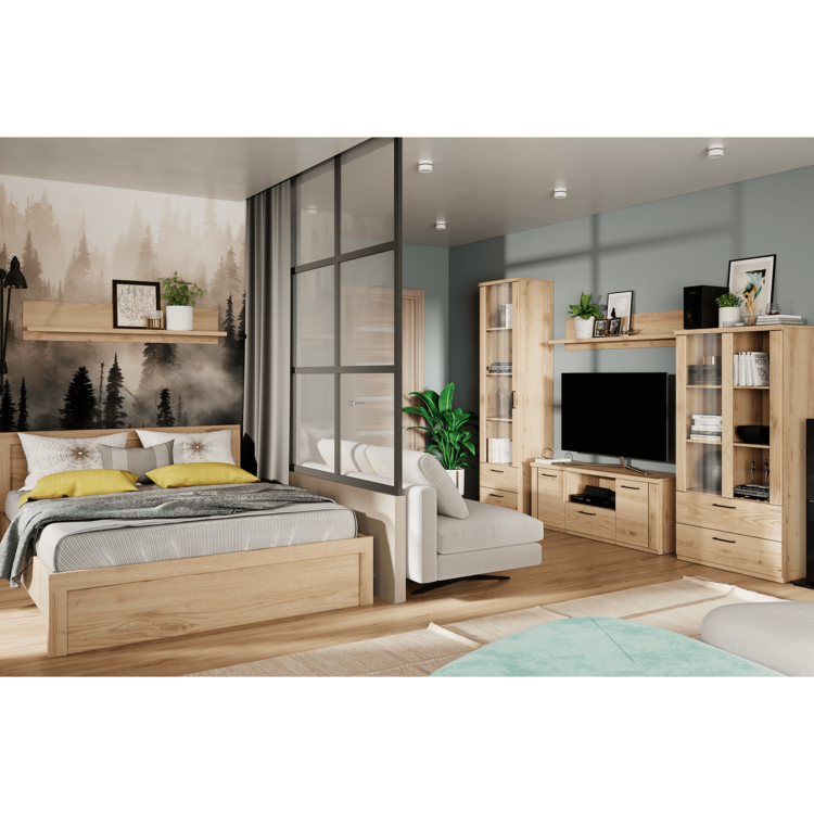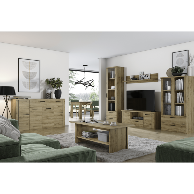 Obývačkový sektor z kolekcie DORSI okúzli nejedného návštevníka vašej domácnosti. Prichádza s množstvom komponentov, s ktorými zariadite nielen obývaciu izbu, ale vkusne dotvoríte priestor vo vašej jedálni, spálni, študentskej izbe, kancelárii alebo predsieni. DORSI je vyrobený z laminovanej drevotriesky, korpus je MDF. Originálny je farebným prevedením dub navarra. Pri manipulácii s nábytkom vám pomôžu praktické čierne kovové úchytky.