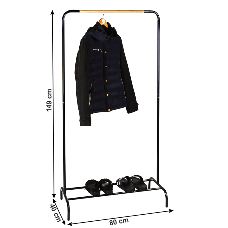 Vyrobený je z kovu v čiernej farbe. Úložný priestor ponúka v podobe vešiakovej tyče, kde je kov skombinovaný s drevom. V spodnej časti sa nachádza polica z tyčí vhodná napríklad na topánky či papuče.