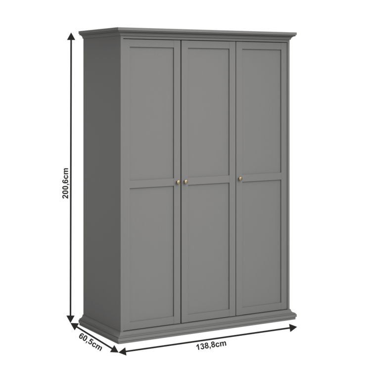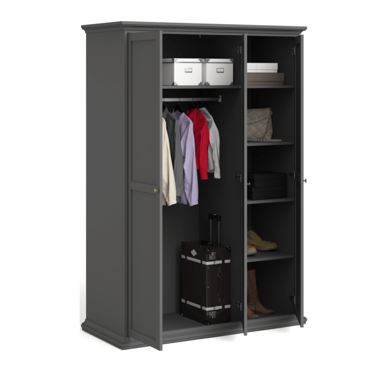 Skriňa je trojdverová a ponúka dostatok úložného priestoru. Je rozdelená na vešiakovú časť, v ktorej sa nachádza aj jedna polica, a policovú časť, ktorú tvorí päť políc.