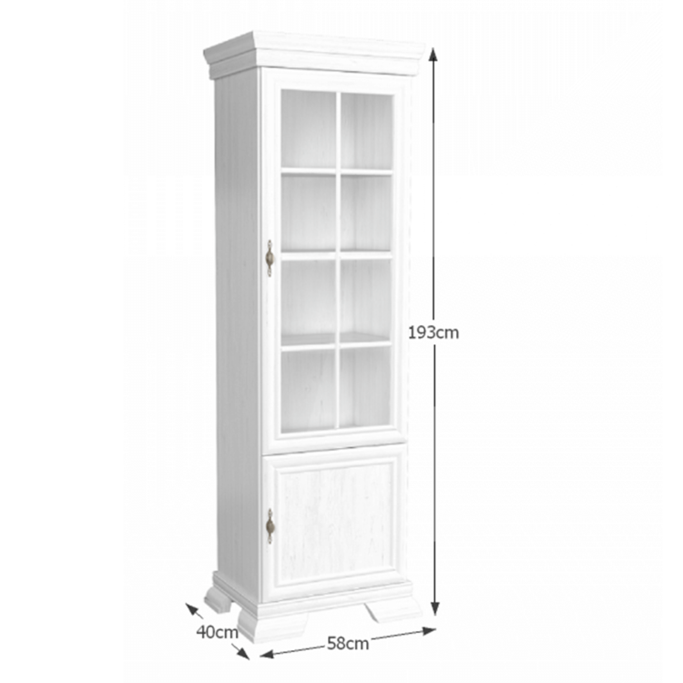 Dvojdverová vitrína KORA KRW1 je tromi policami rozdelená na štyri úložné priestory. Dvere sú so sklom. V spodnej časti je ešte jedna skrinka s plnými dverami.