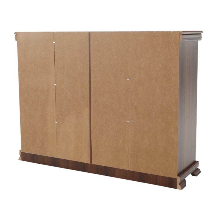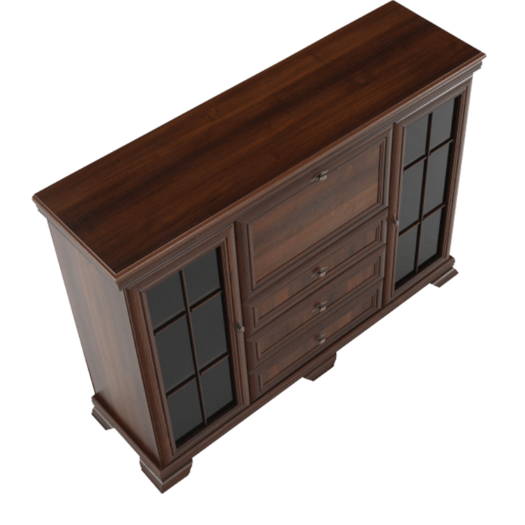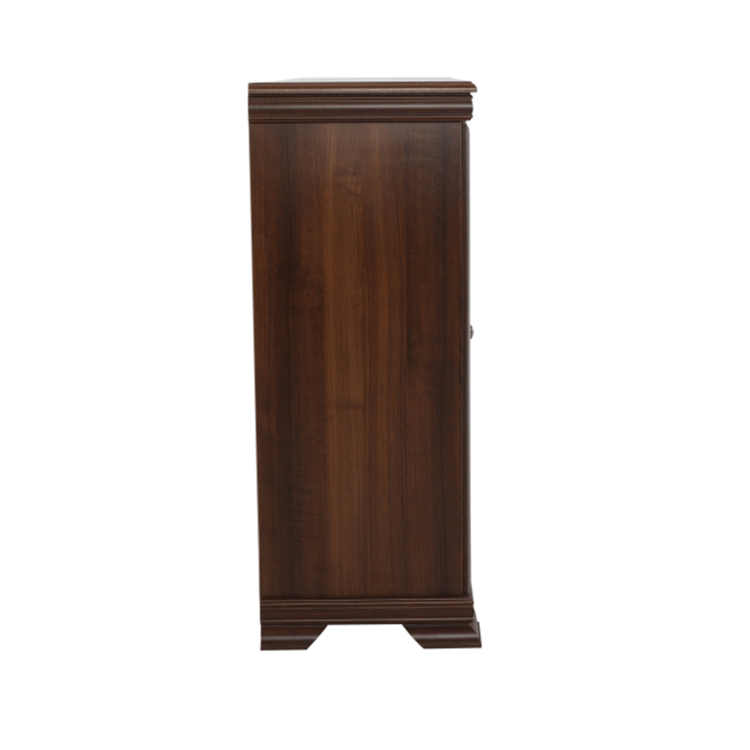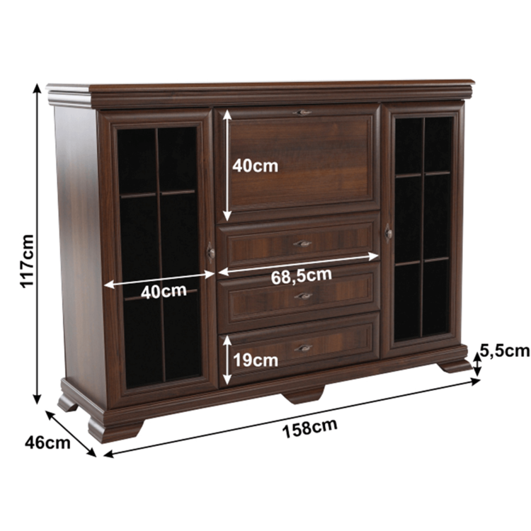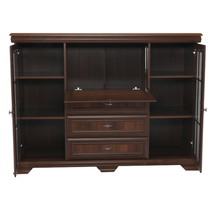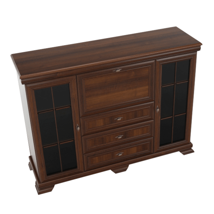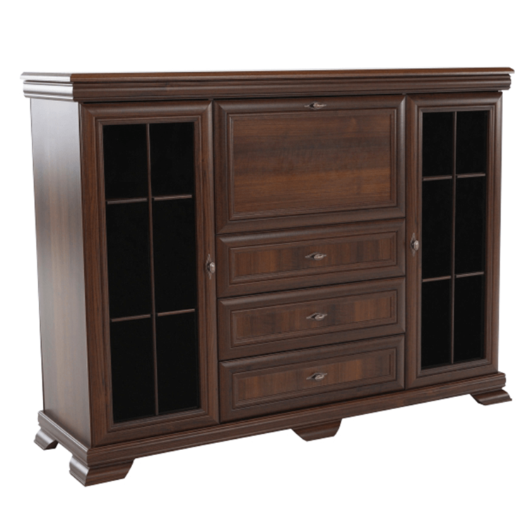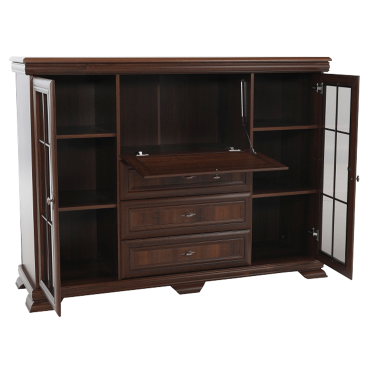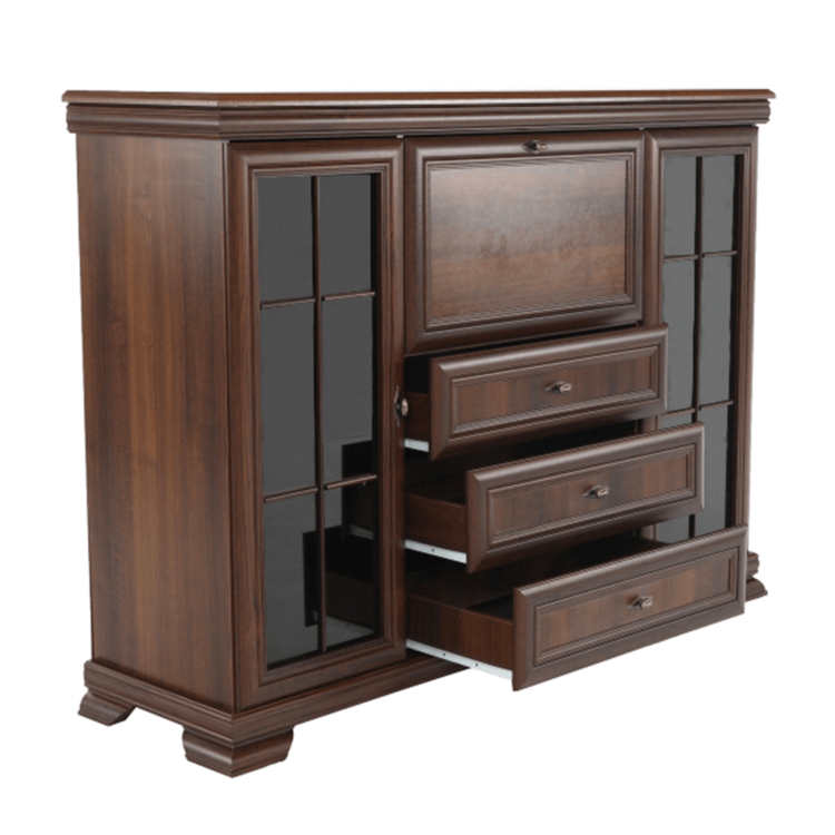 Komoda KORA KK6 je kombinovaná s barovou skrinkou. Úložný priestor poskytujú ďalšie dve vitrínové skrinky a tri rovnako hlboké šuplíky. Skrinky sú dvomi policami rozdelené na tri odkladacie plochy. Dvere vitrín sú so sklom.