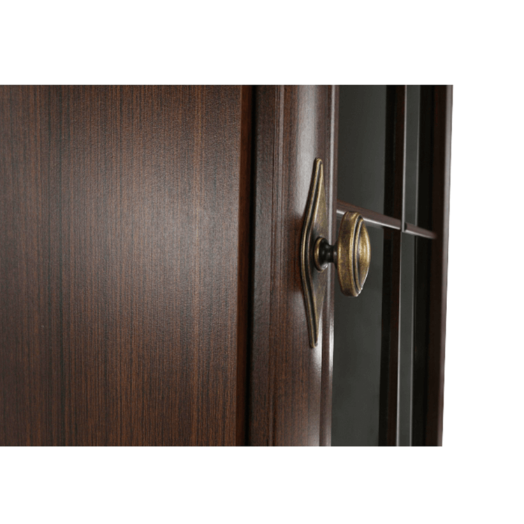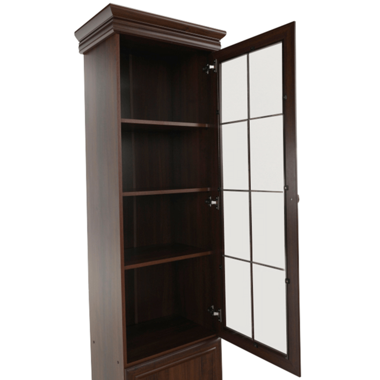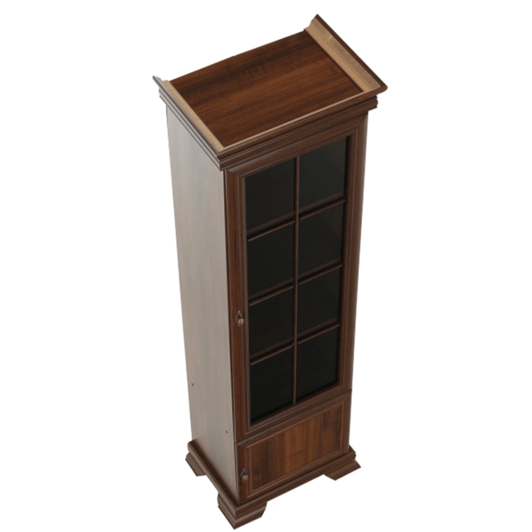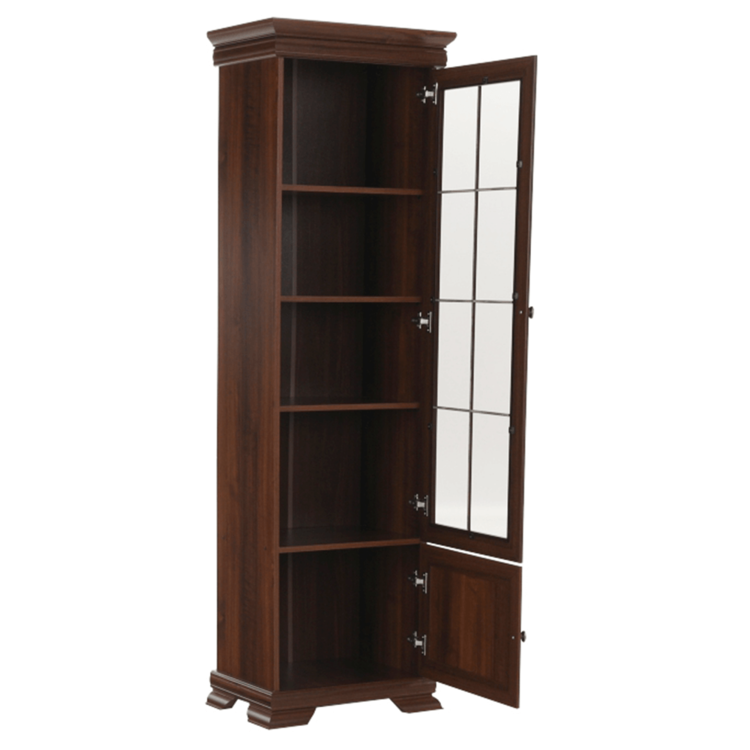 Dvojdverová vitrína KORA KRW1 je tromi policami rozdelená na štyri úložné priestory. Dvere sú so sklom. V spodnej časti je ešte jedna skrinka s plnými dverami.