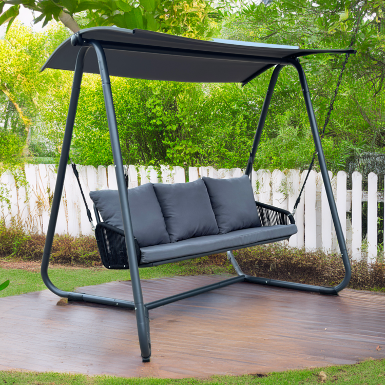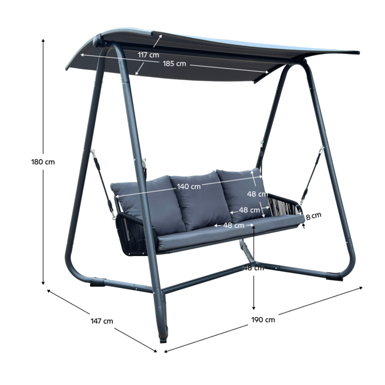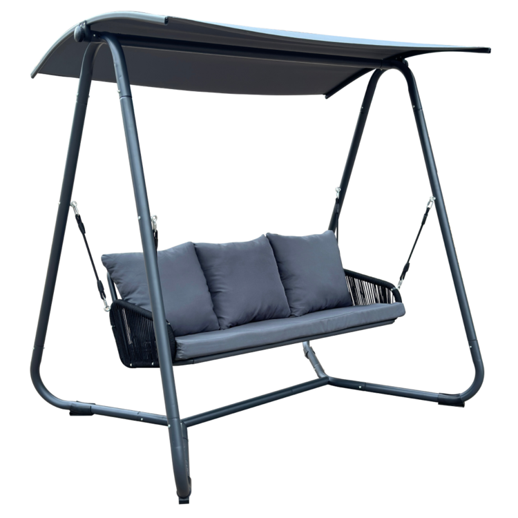 Záhradná hojdačka JAIRA je skvelou voľbou na vytvorenie štýlového a pohodlného prostredia vo vašej záhrade alebo na terase. Jej kovová konštrukcia v tmavosivej farbe poskytuje odolnosť a pevnosť. Komfort pri hojdaní zabezpečujú vankúše zo sivej látky. Hojdačka je vybavená strieškou, ktorá vás ochráni pred slnkom a umožní vám si užiť relax aj počas horúcich dní. JAIRA oživí váš vonkajší priestor a spríjemní každé posedenie na čerstvom vzduchu.