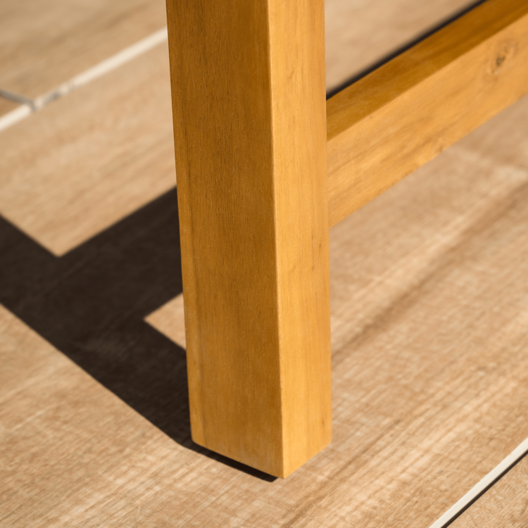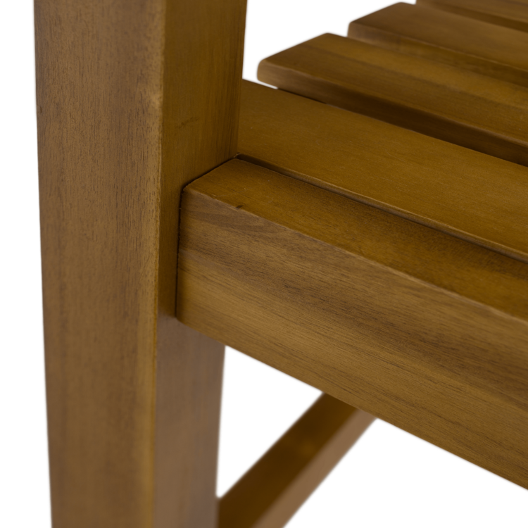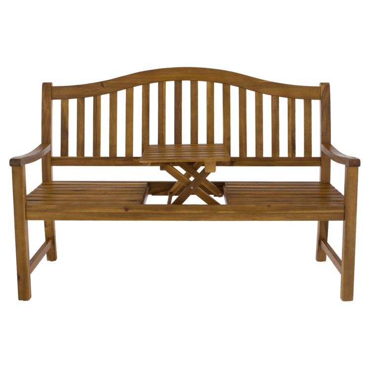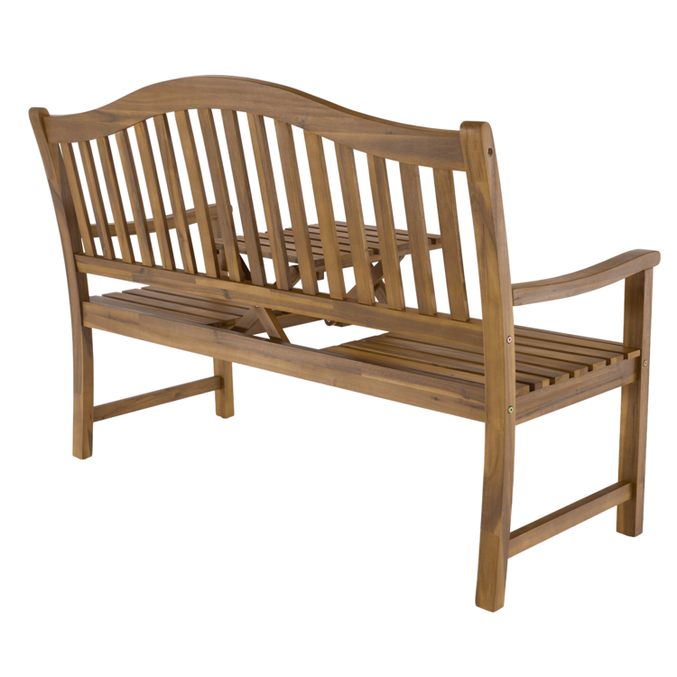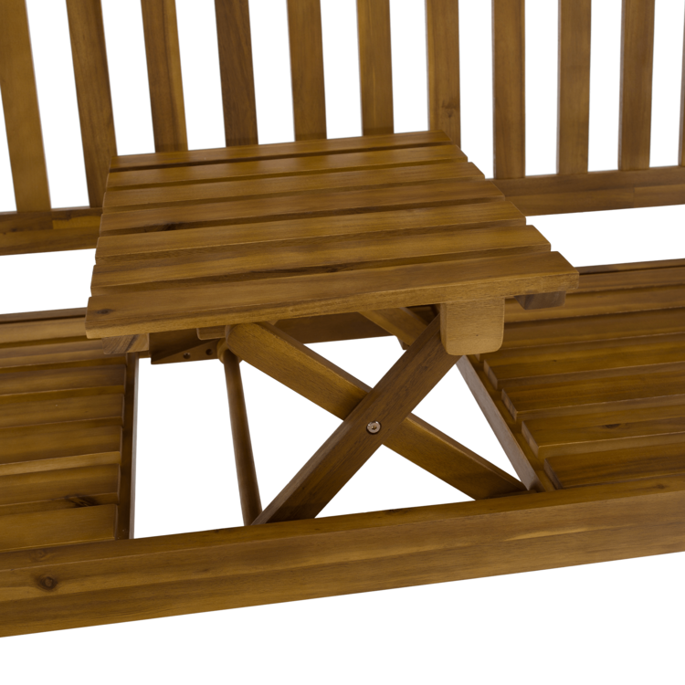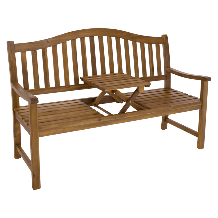 Jej elegantný dizajn s jemne zaobleným operadlom a ergonomicky tvarovanými podrúčkami zaisťuje pohodlné sedenie. Vyrobená je z kvalitného masívneho akáciového dreva v prírodnom farebnom odtieni akácie. Výnimočnou ju robí praktický výsuvný stolík umiestnený v strede, ktorý poskytne miesto na odkladanie pohárov, telefónu alebo iných drobností. V prípade potreby ho možno jednoducho sklopiť a opäť využiť celú lavičku na sedenie.