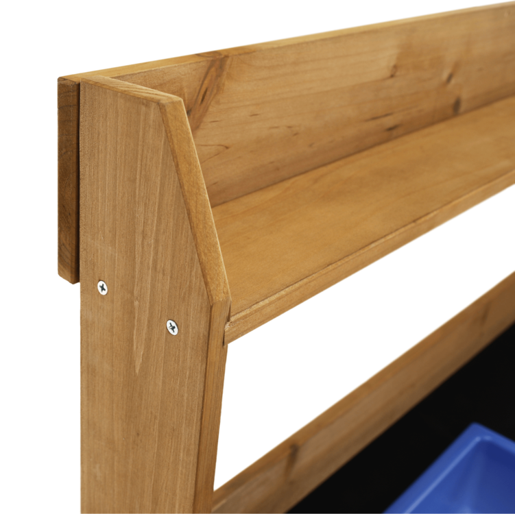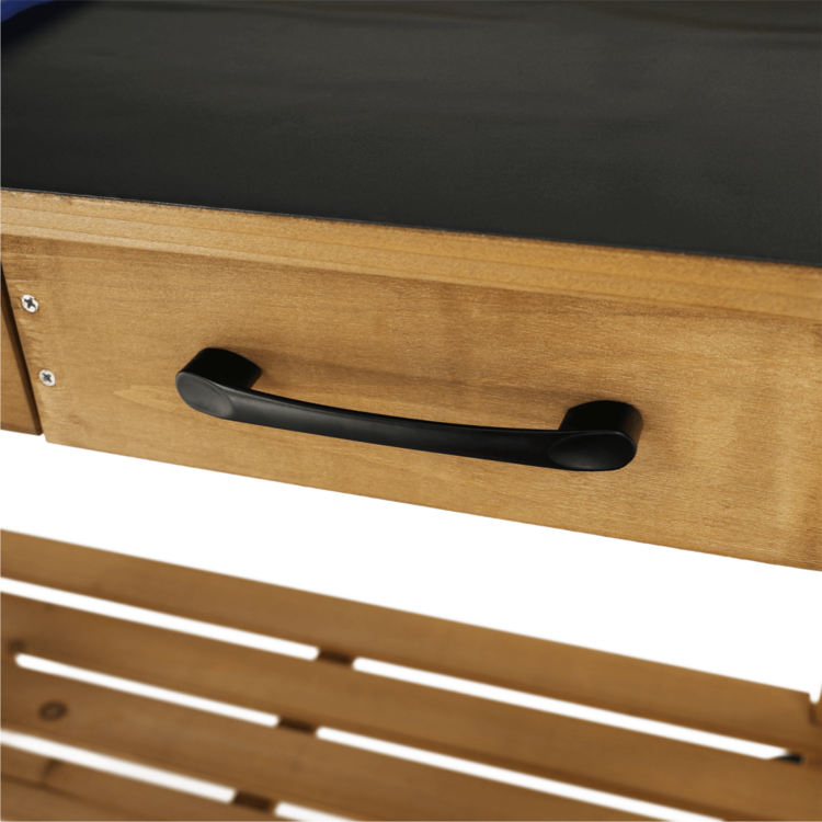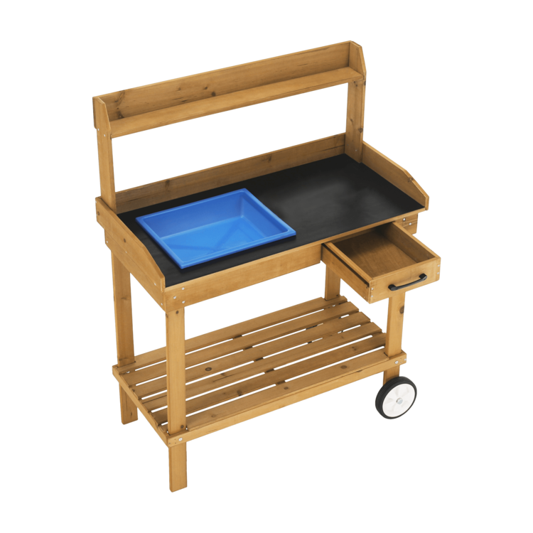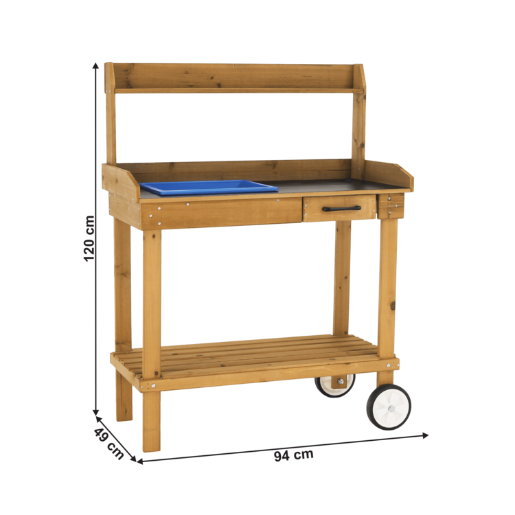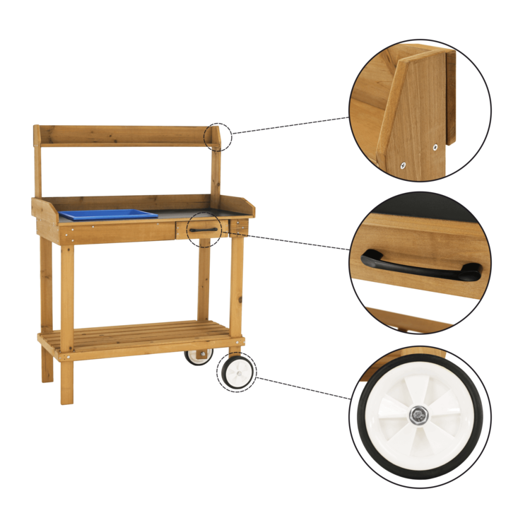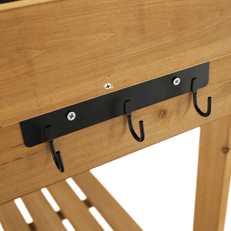 Pracovný stôl BARDY je skvelým doplnkom každej záhradnej párty, rodinnej grilovačky alebo bežnej práce v záhradke. Stôl je vyrobený z dreva a poskytuje množstvo úložného priestoru. Disponuje pracovnou doskou, jednou veľkou a jednou malou odkladacou policou, jednou zásuvkou a troma háčikmi situovanými na boku stola. Okrem toho má aj odnímateľnú nádobu, ktorá môže poslúžiť ako umývadlo. Stôl má univerzálnu hnedú farbu a vďaka dvom kolieskam ho dokážete jednoducho a ľahko presúvať.