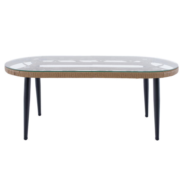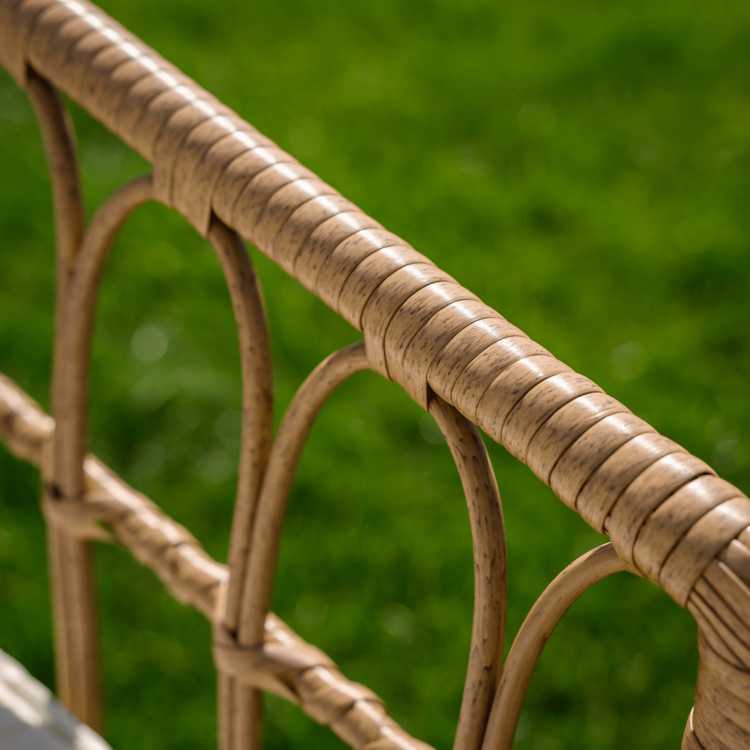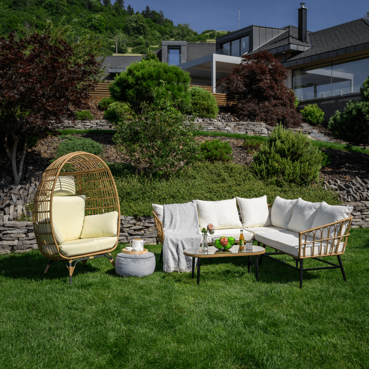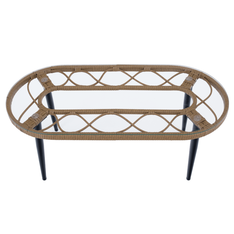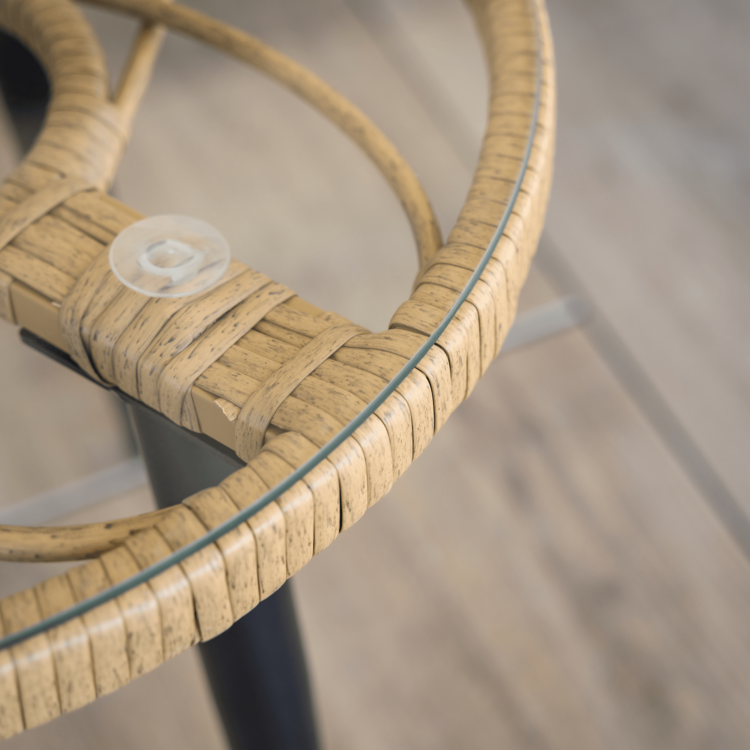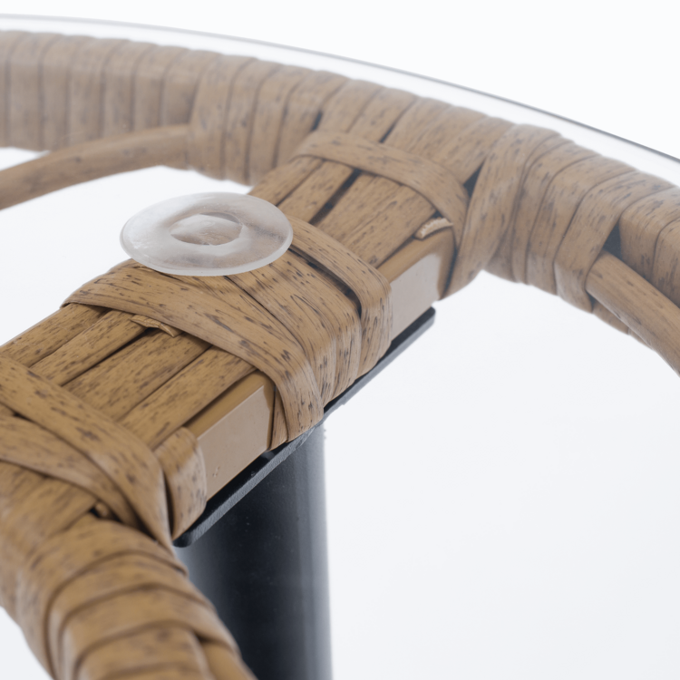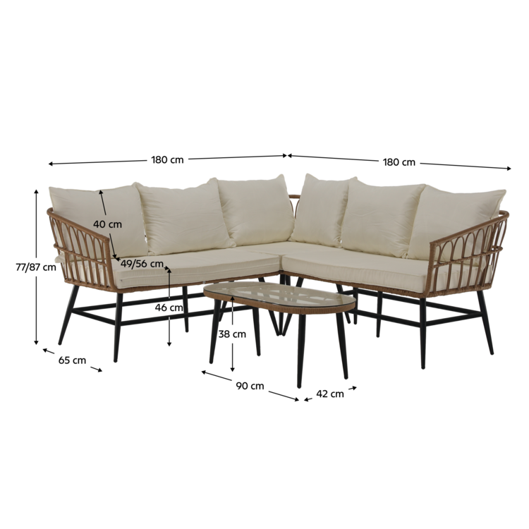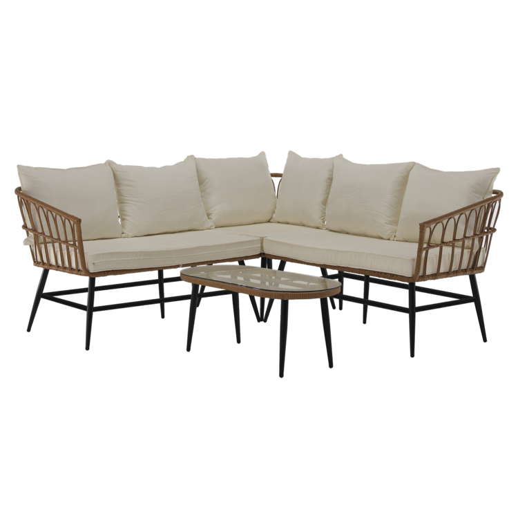 Set obsahuje roh a konferenčný stolík s tvrdeným sklom. Konštrukciu tvorí čierny kov. Výplet setu a stolíka je vyrobený z technoratanu v prírodnej farbe. Konferenčný stolík tvorí 5 mm tvrdené sklo. Stôl je stabilný a pevný. Eleganciu a komfort dotvárajú vankúše, ktoré slúžia aj ako opierka na chrbát, v béžovej farbe.