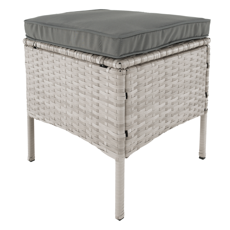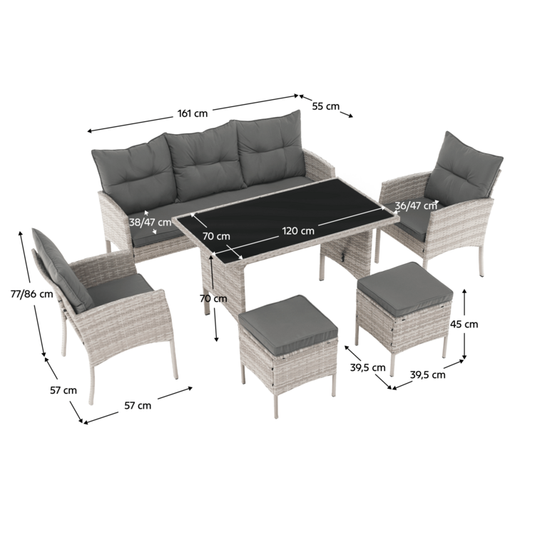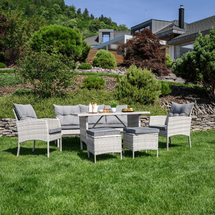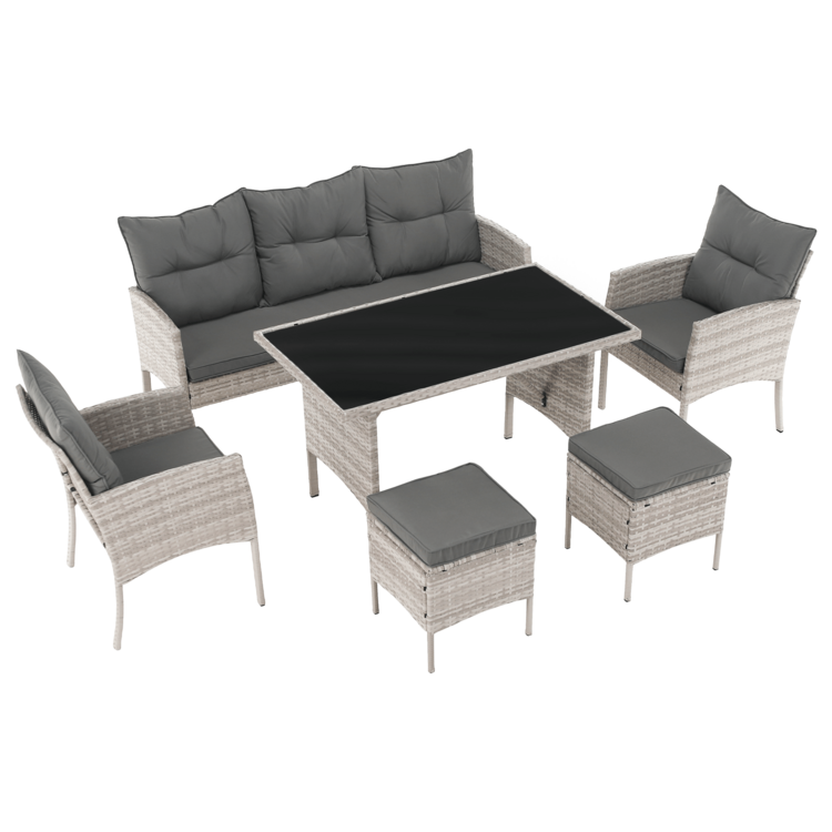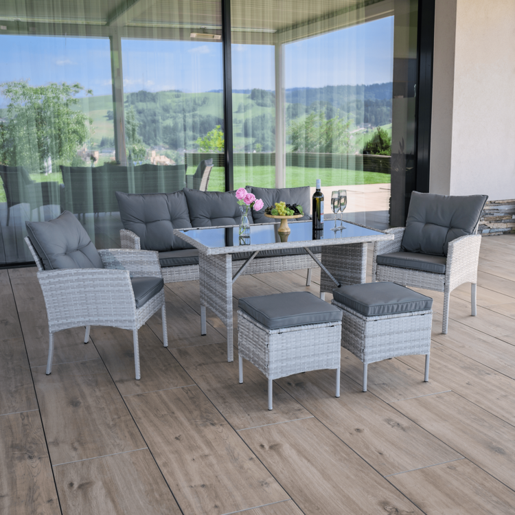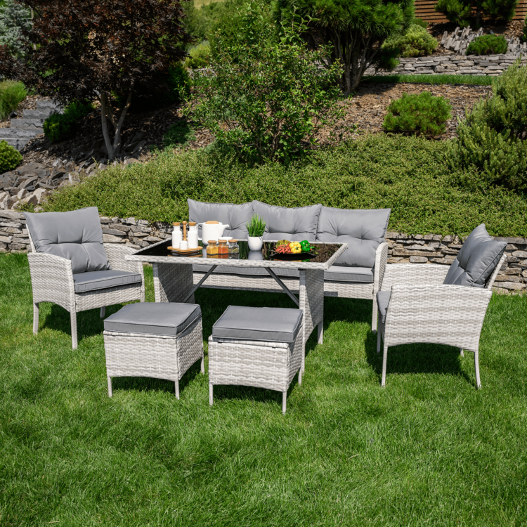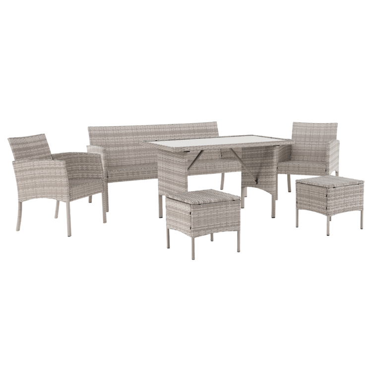 Ratanový 6-dielny set LALEN. Vyrobený je z technoratanu v svetlosivom farebnom prevedení. O stabilitu sa postará pevná kovová konštrukcia. Set tvorí trojsed, kreslá, taburety a jedálenský stôl s tvrdeným sklom, ktorý ponúka miesto na servírovanie akýchkoľvek dobrôt. O pohodlné sedenie a opretie chrbta sa postarajú vankúše v svetlosivej farbe, ktoré sú taktiež súčasťou setu. Poťahy na vankúšoch sú vodeodolné.