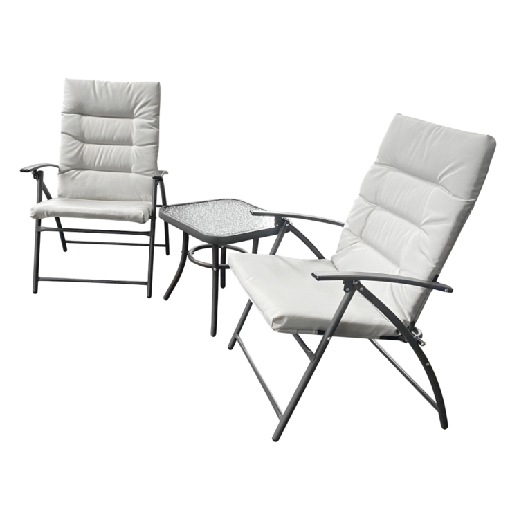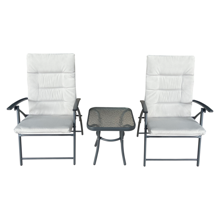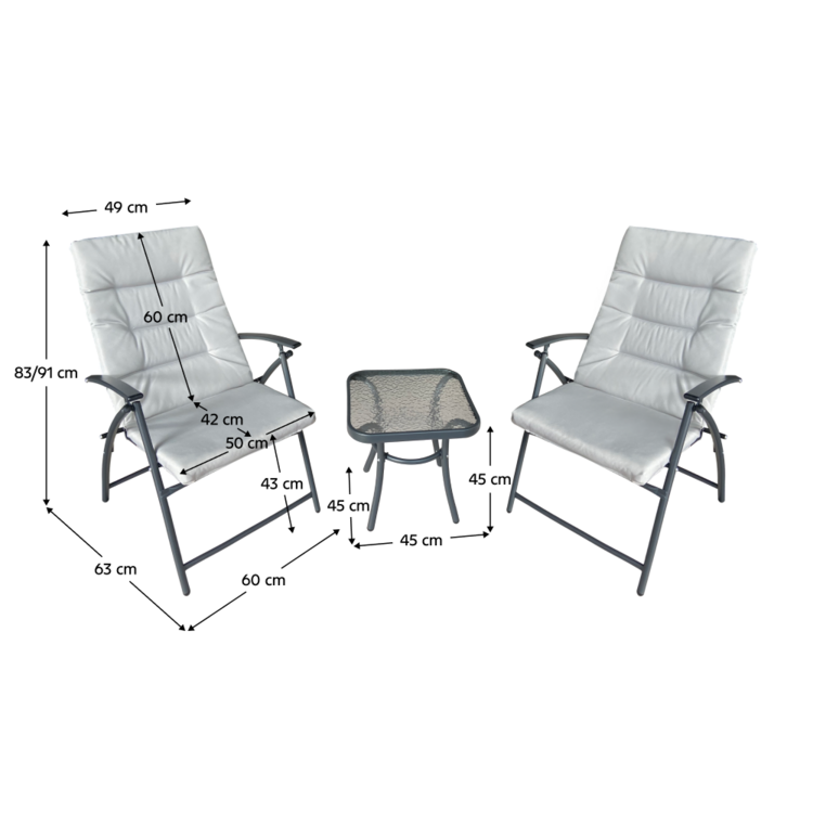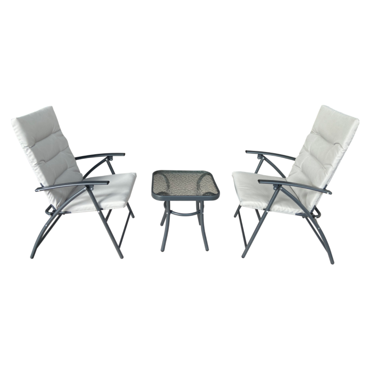 Set obsahuje dve kreslá a konferenčný stolík s tvrdeným sklom, na servírovanie akýchkoľvek dobrôt. Pohodlie kresiel zvyšujú vankúše v svetlosivej látke, poťah je vodeodolný. Kovový rám v tmavosivom prevedení zaručuje trvanlivosť a stabilitu. Vytvorte si na záhrade či terase príjemný kútik so záhradným setom MUSON.
