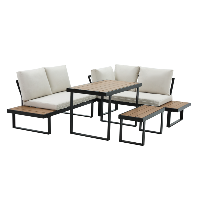Moderné prevedenie v kombinácii čiernej farby, dekoru dub a krémových vankúšov pôsobí elegantne a nadčasovo. Pevná kovová konštrukcia zabezpečuje stabilitu a dlhú životnosť, zatiaľ čo drevené odkladacie plochy z polywoodu dodávajú zostave prirodzený vzhľad.